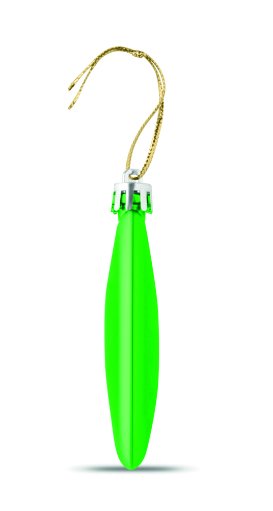 Płaska bombka świąteczna z PP, z metalicznym wykończeniem oraz wstążką.