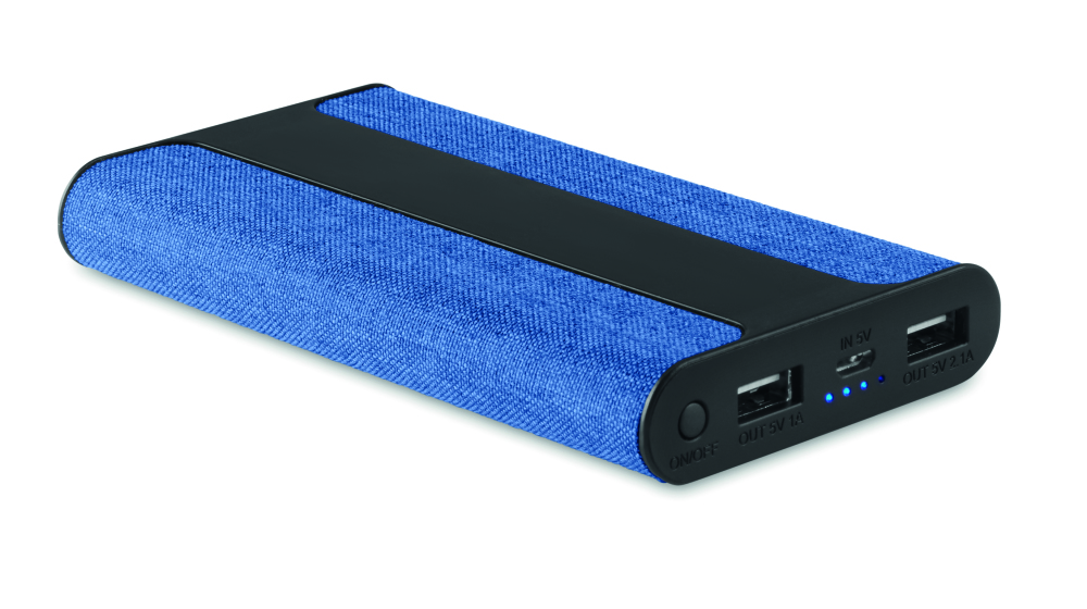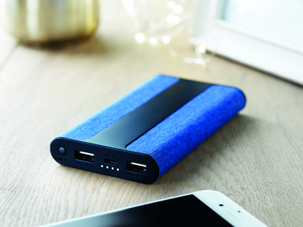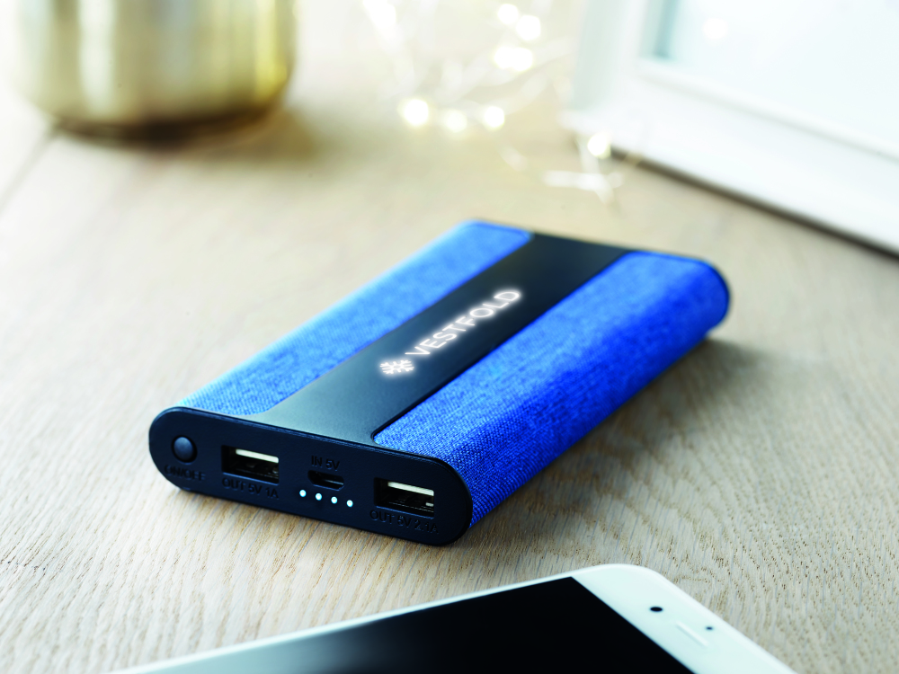 Powerbank 6000 mAh z wykończeniem z tkaniny oraz powierzchnią podświetlającą umieszczone na niej logo. Pojemność odpowiednia do użycia ze smartfonami, dane wyjściowe DC5V/2.1A. Posiada diodę wskazującą oraz kabel USB z wtyczką micro usb.