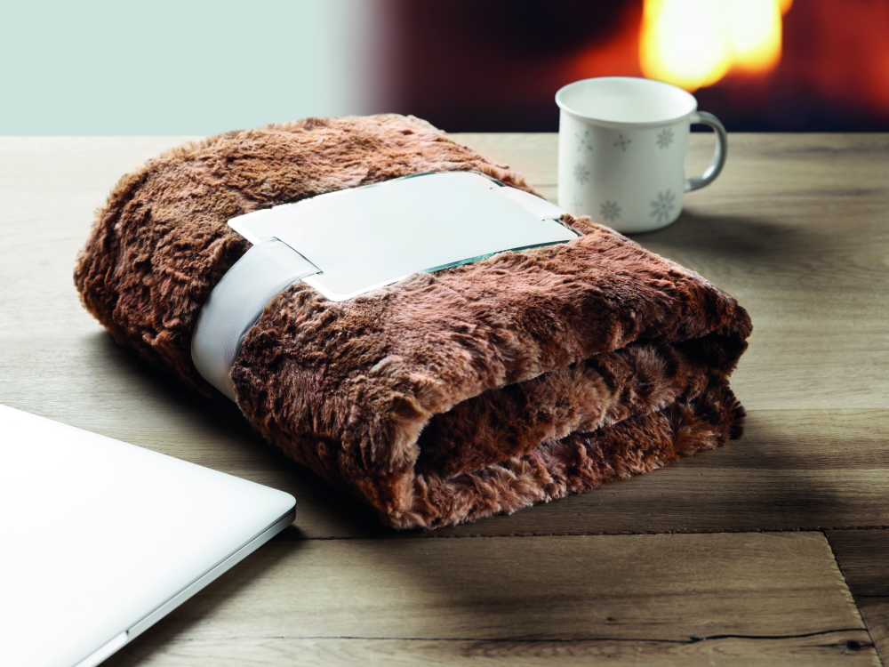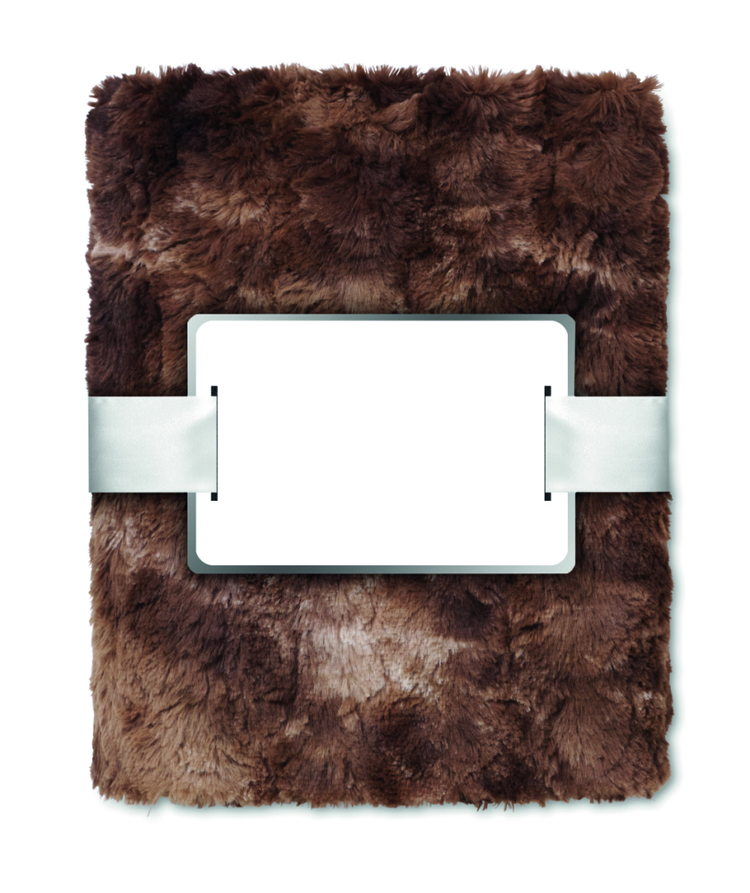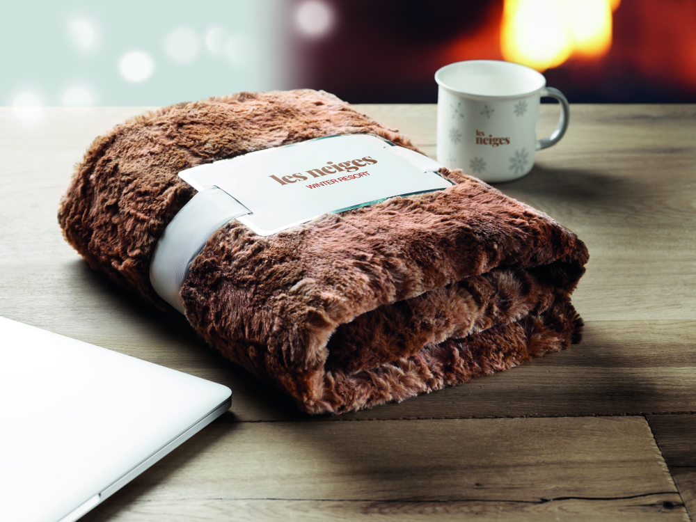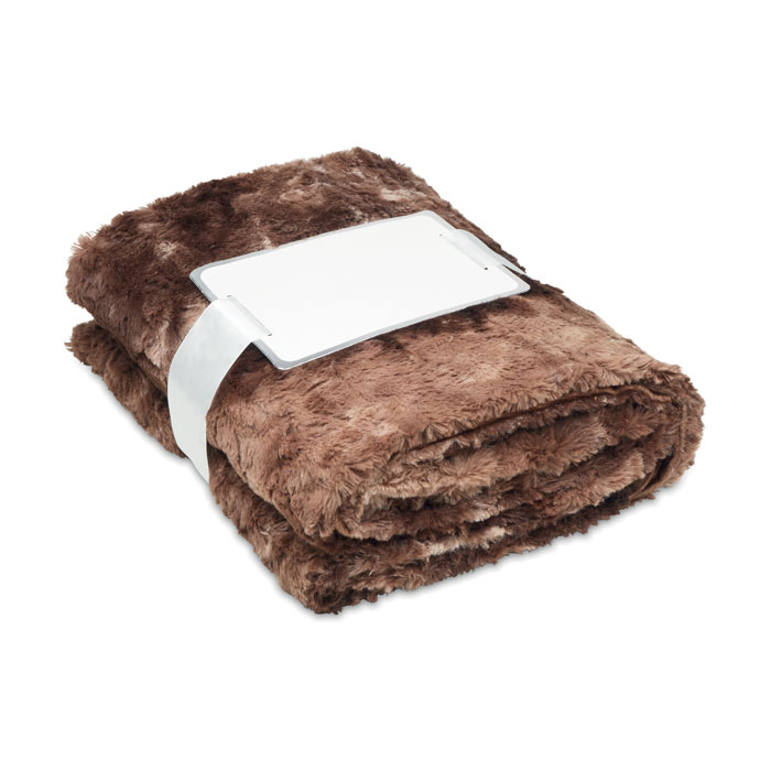 Koc ze sztucznego futra, 260 g/m², 100% poliester, druga strona z micromink 180g/m² . Przewiązany wstążką, dołączona etykieta do nadruku.