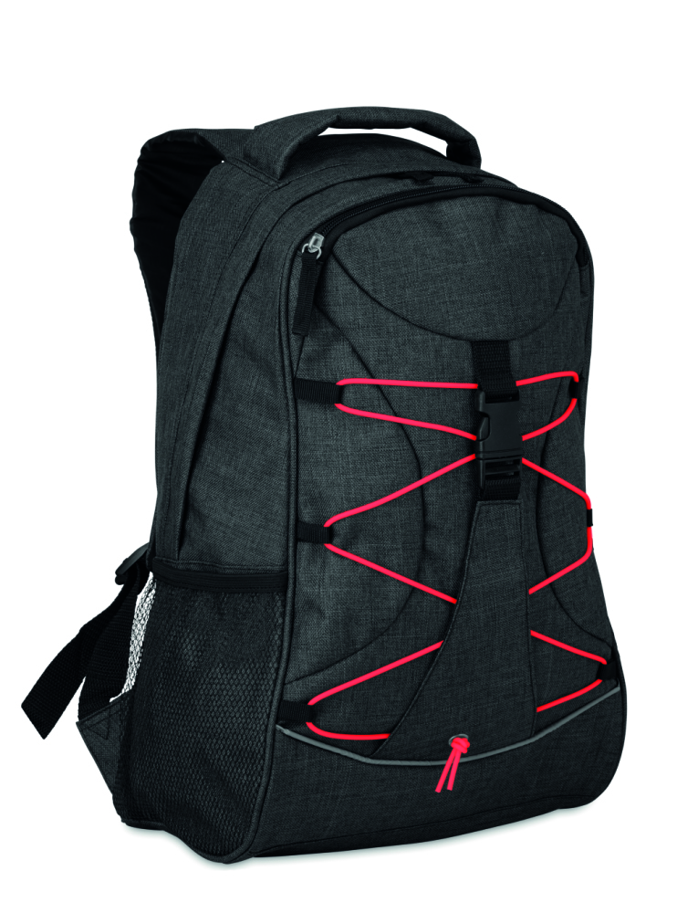 Plecak wykonany z 2-kolorowego poliestru 600D z kontrastującym kolorowym sznurkiem świecącym w ciemności. Siatkowe kieszenie po obu stronach.