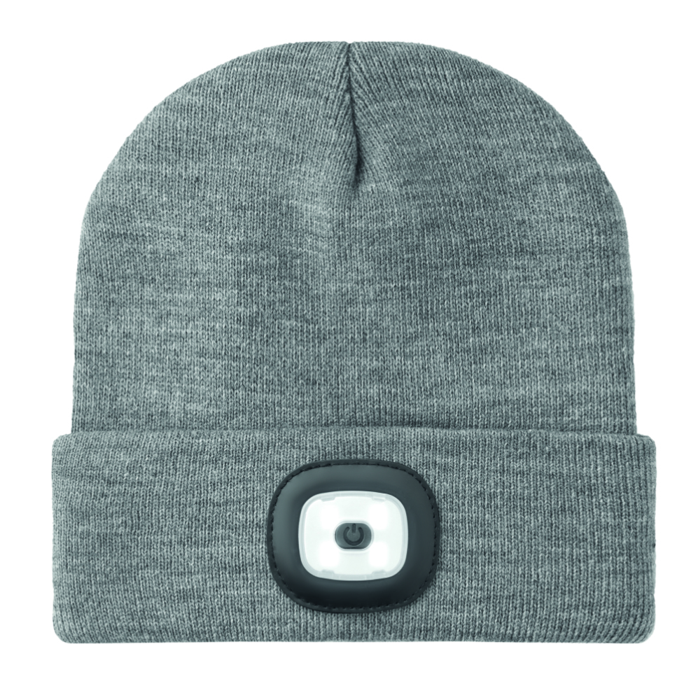 Czapka z akrylu z odpinaną lampką COB z przodu. 3 stopnie świecenia. Dołączony akumulator 150 mAh oraz kabel do ładowania USB.