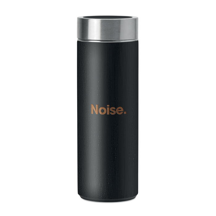 Termos z podwójnymi ściankami, stal nierdzewna z bambusową obudową, 400 ml, z dodatkowym zaparzaczem do herbaty.