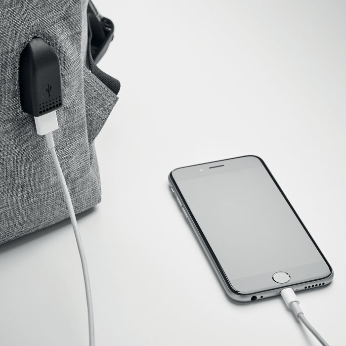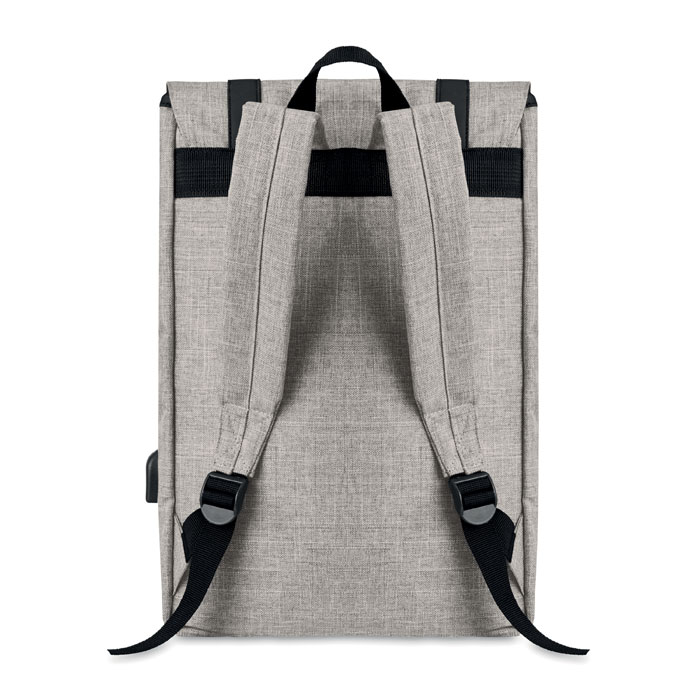 Plecak na laptop z poliestru 600D z wyściełanymi paskami na ramiona, główna komora na laptop 15-calowy, kabel USB do ładowania. Zawiera zapięcie na zatrzask magnetyczny i jedną przednią kieszeń zapinaną na suwak.