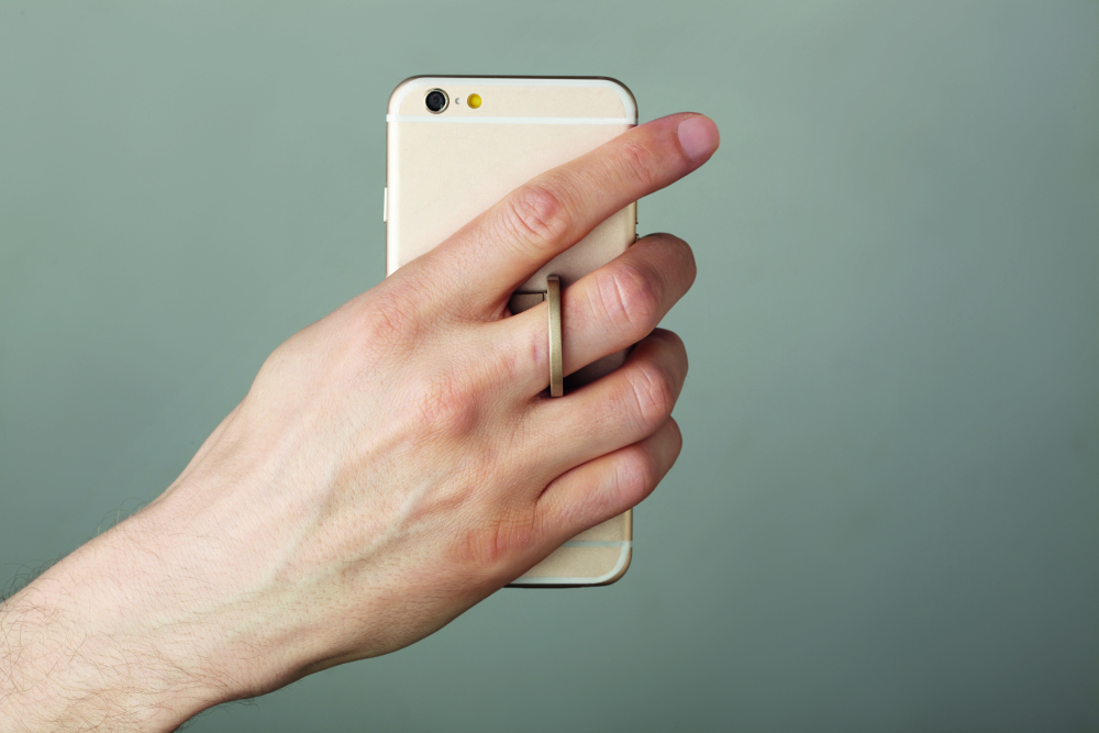 Uchwyt na telefon zakładany na palec, z cynku. Mocowany za pomocą warstwy samoprzylepnej 3M.