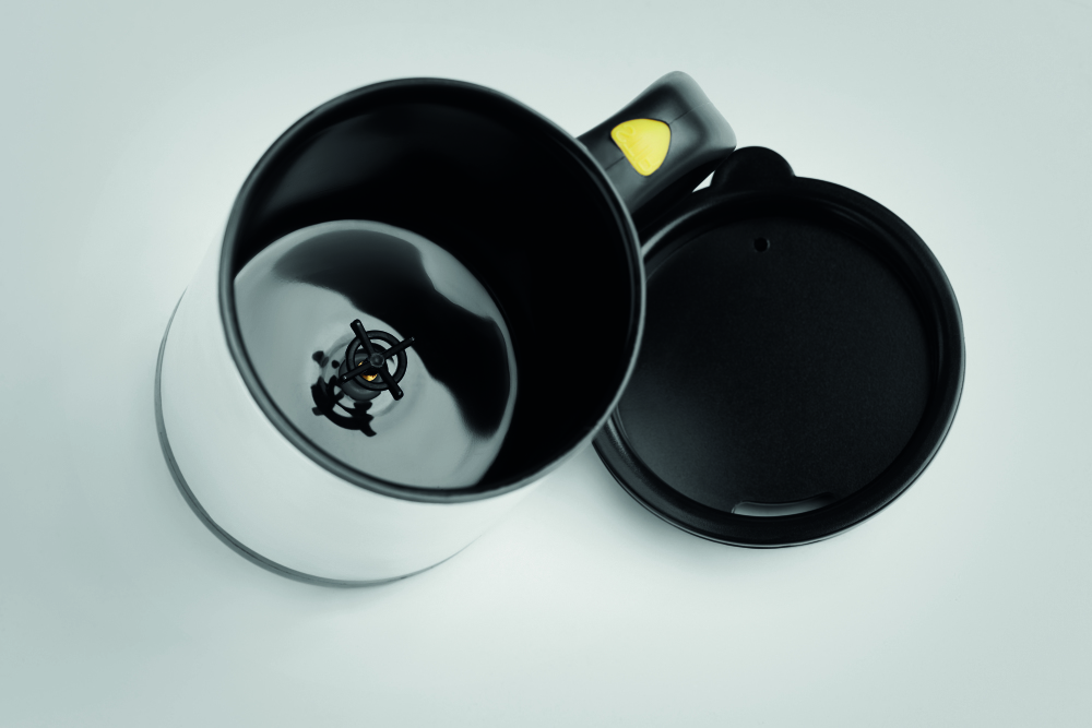Kubek z mieszadłem z podwójną ścianką. Stal nierdzewna na zewnątrz, wewnętrzne ścianki z PP. Pojemność: 360 ml. 2 baterie AAA nie dołączone.