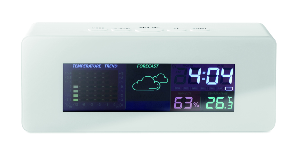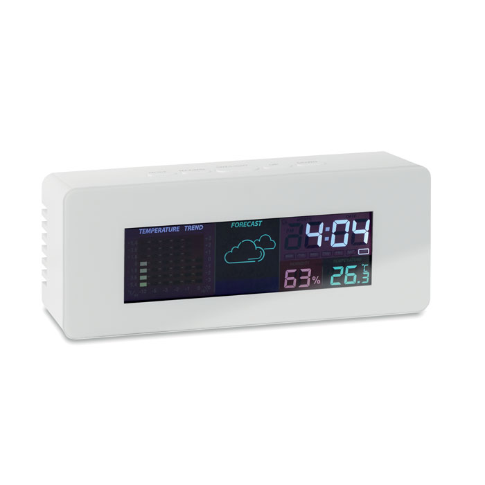 Stacja pogodowa z kolorowym wyświetlaczem LED, dostarcza informacje o trendach pogodowych. W zestawie kabel USB do zasilania.Nie zawiera 3 baterii AAA.