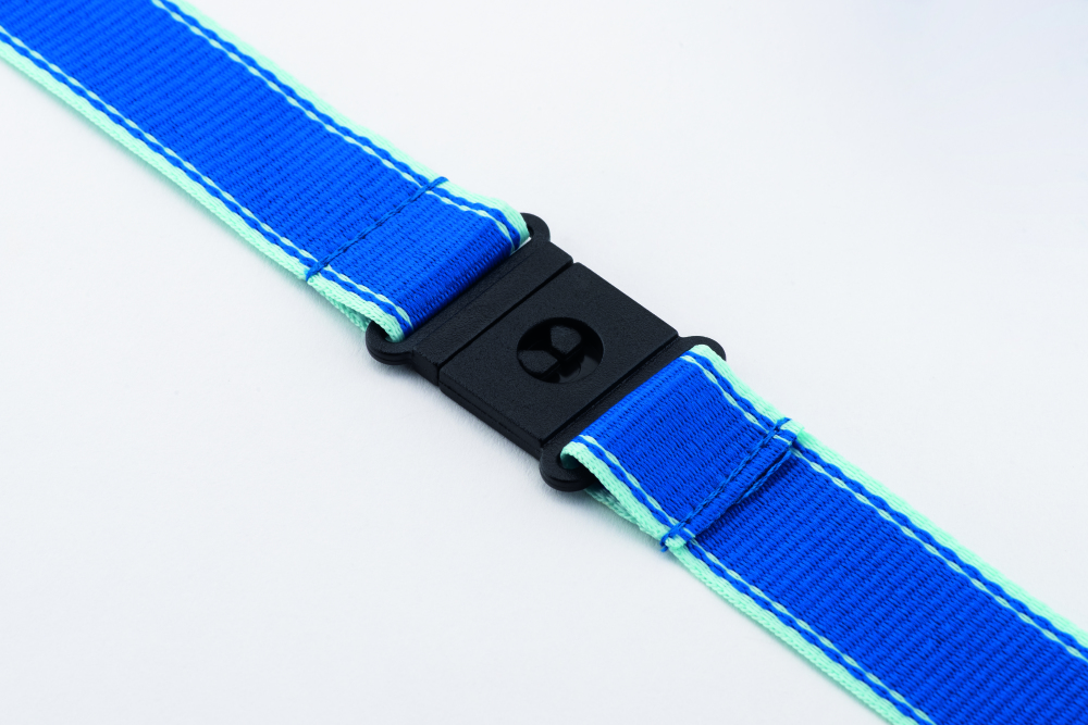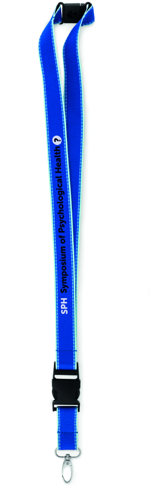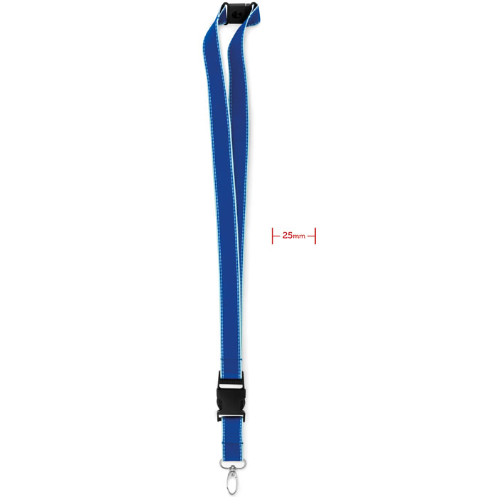 Smycz świecąca w ciemności 25mm, z metalowym karabinkiem, odpinaną klamrą oraz złączką bezpieczeństwa.