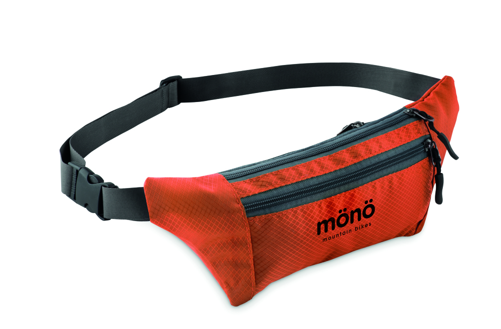 Saszetka na biodro z żakardowego poliestru z 2 zapinanymi na zamek przednimi przegrodami, 1 zapinaną na zamek kieszenią z tyłu i regulowanym paskiem w talii.