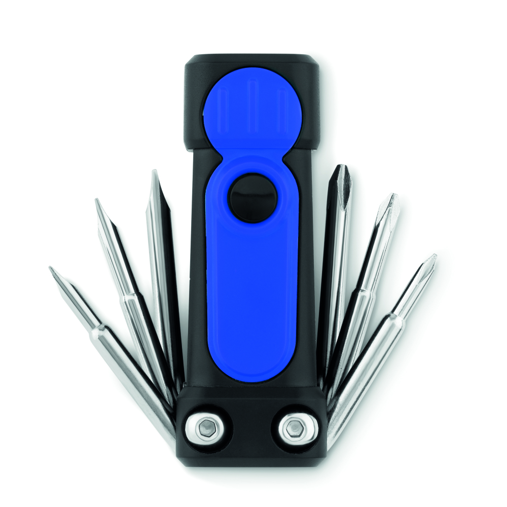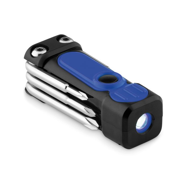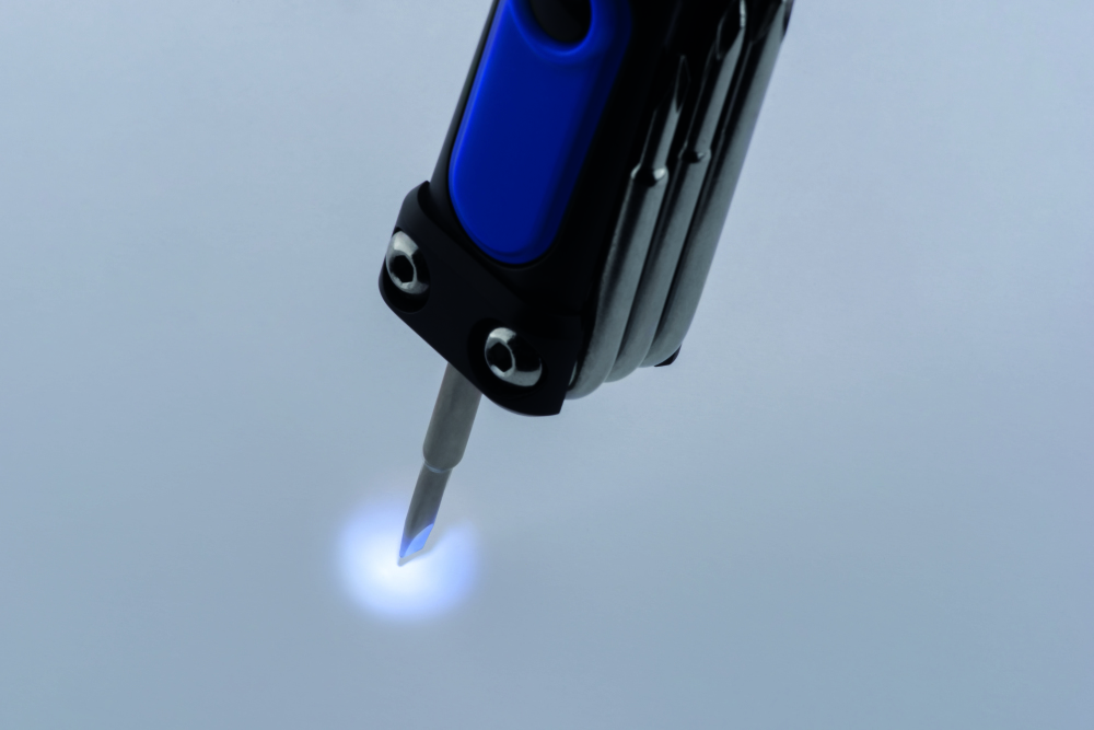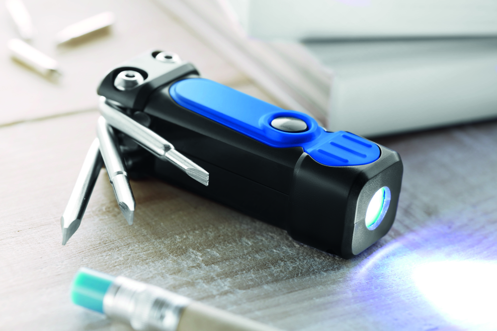 Wielofunkcyjne narzędzie 8 w 1 ze zintegrowaną latarką COB i światłem migającym, zapewnia dodatkową widoczność podczas użycia. W zestawie 3 baterie LR44.