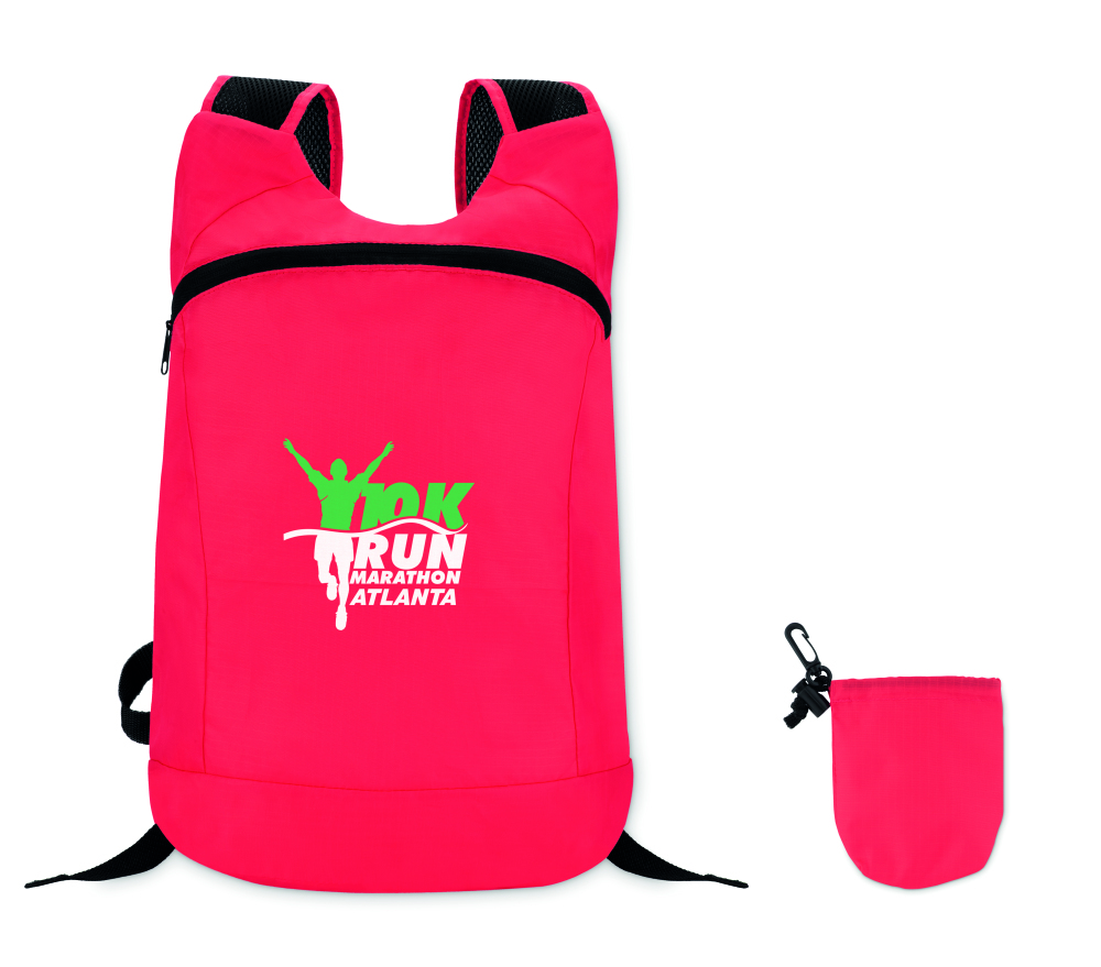 Składany plecak sportowy z poliestru Ripstop z zapinaną na zamek przednią komorą, siatkowym paskiem na ramię i dołączanym odpinanym pokrowcem.