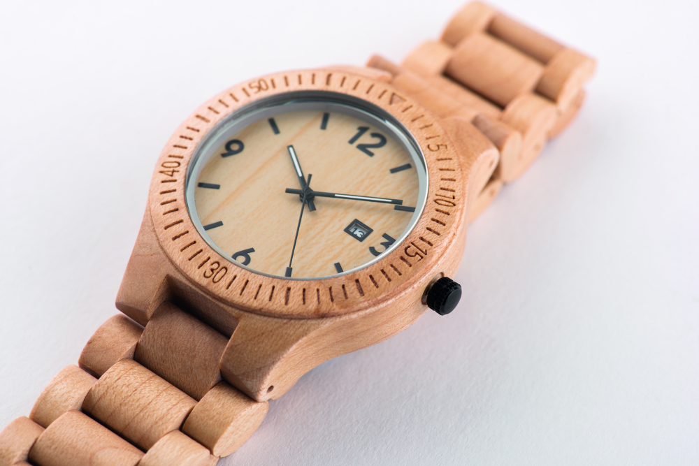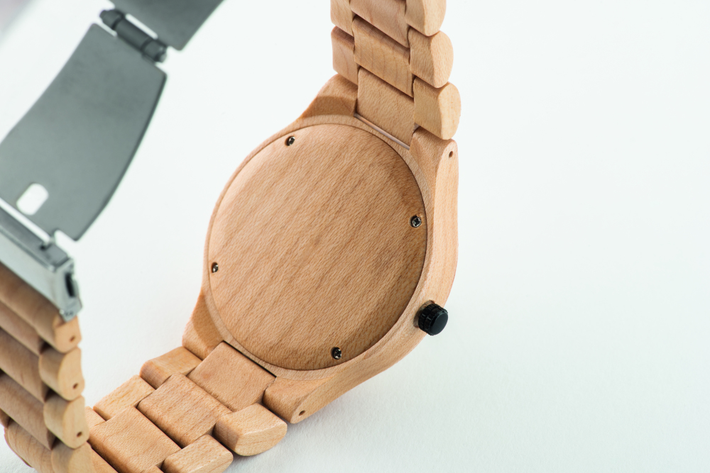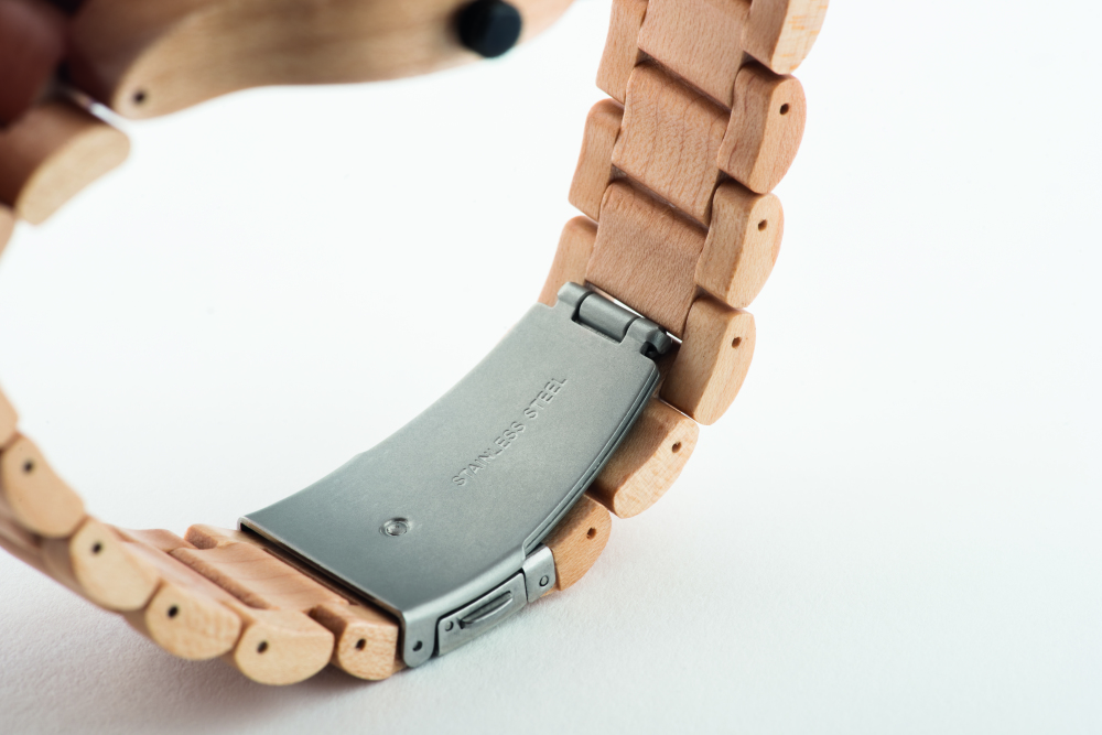 Modny zegarek kwarcowy, wykonany z naturalnego drewna. Zapakowany w papierowe pudełko upominkowe.