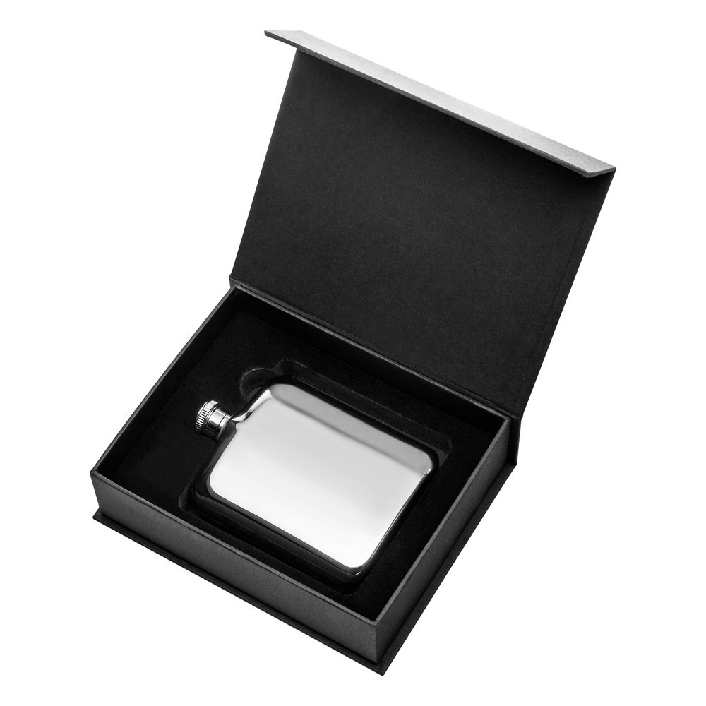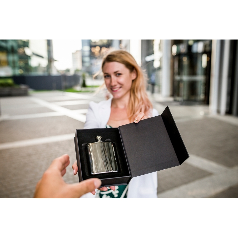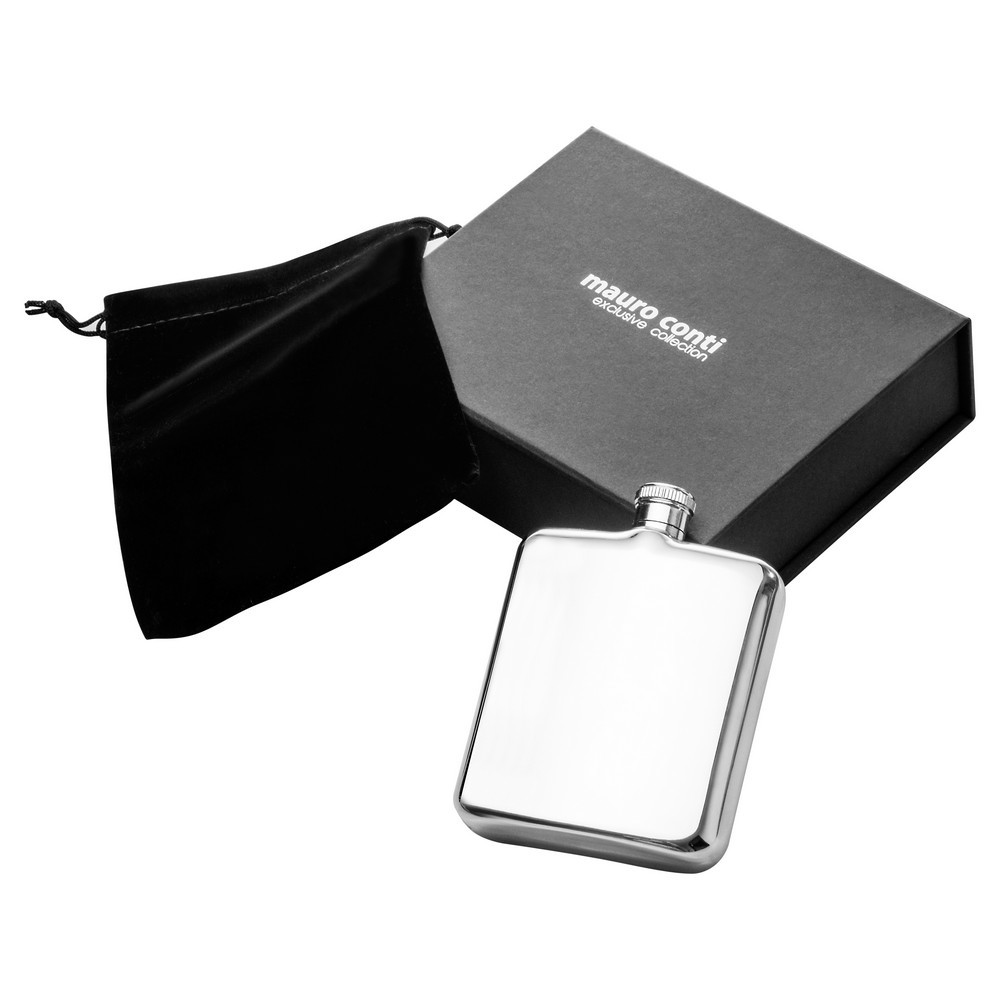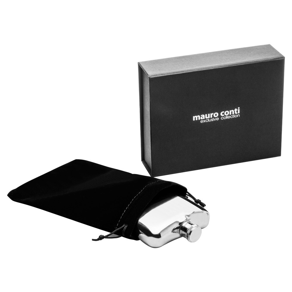 Luksusowa piersiówka Mauro Conti 210 ml, unikalny kształt i połysk, aksamitny woreczek w komplecie, w ozdobnym pudełku