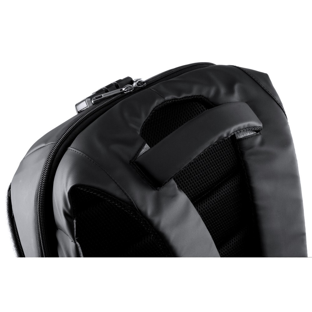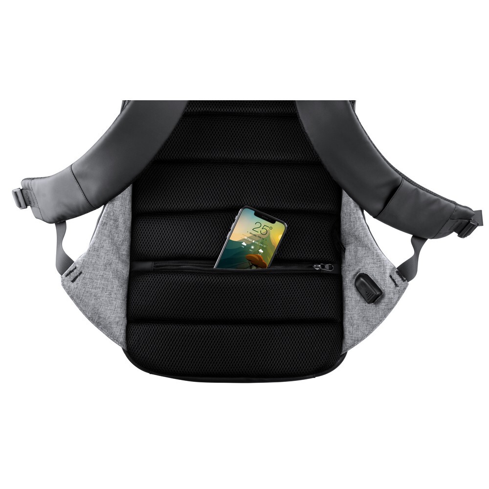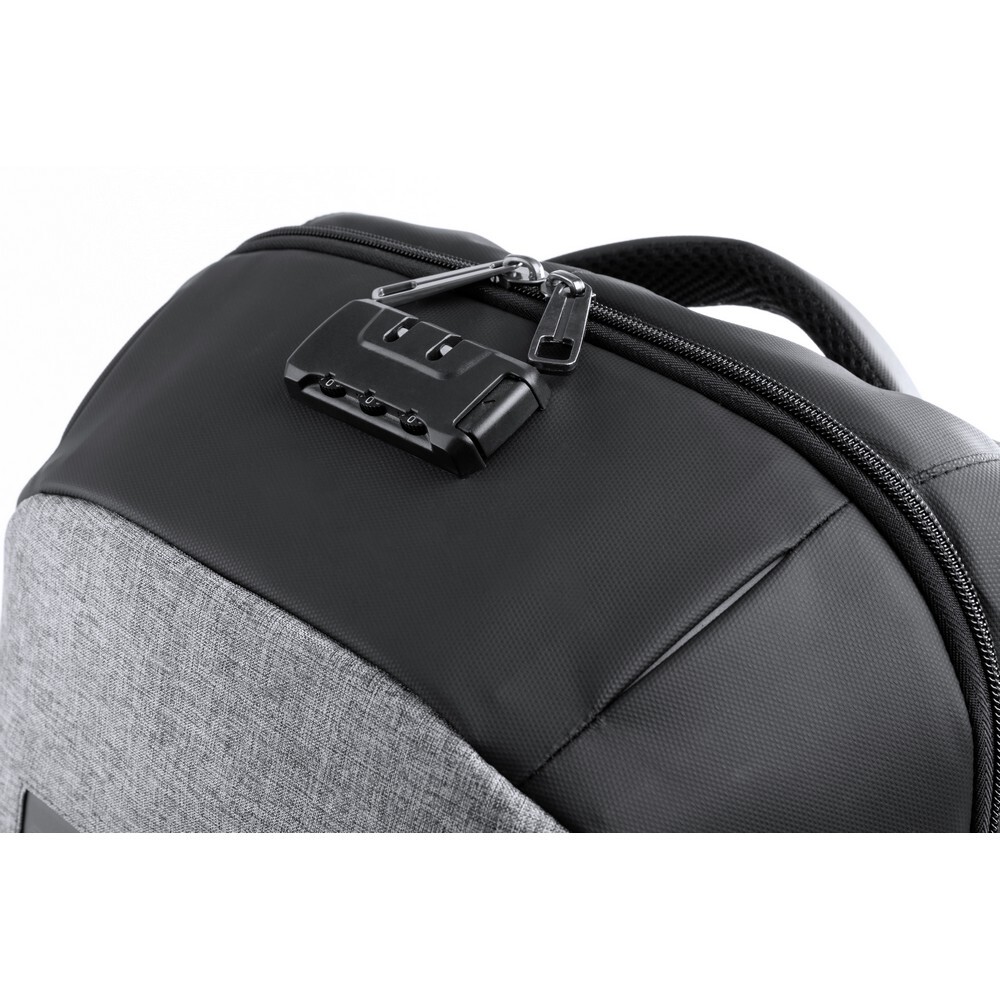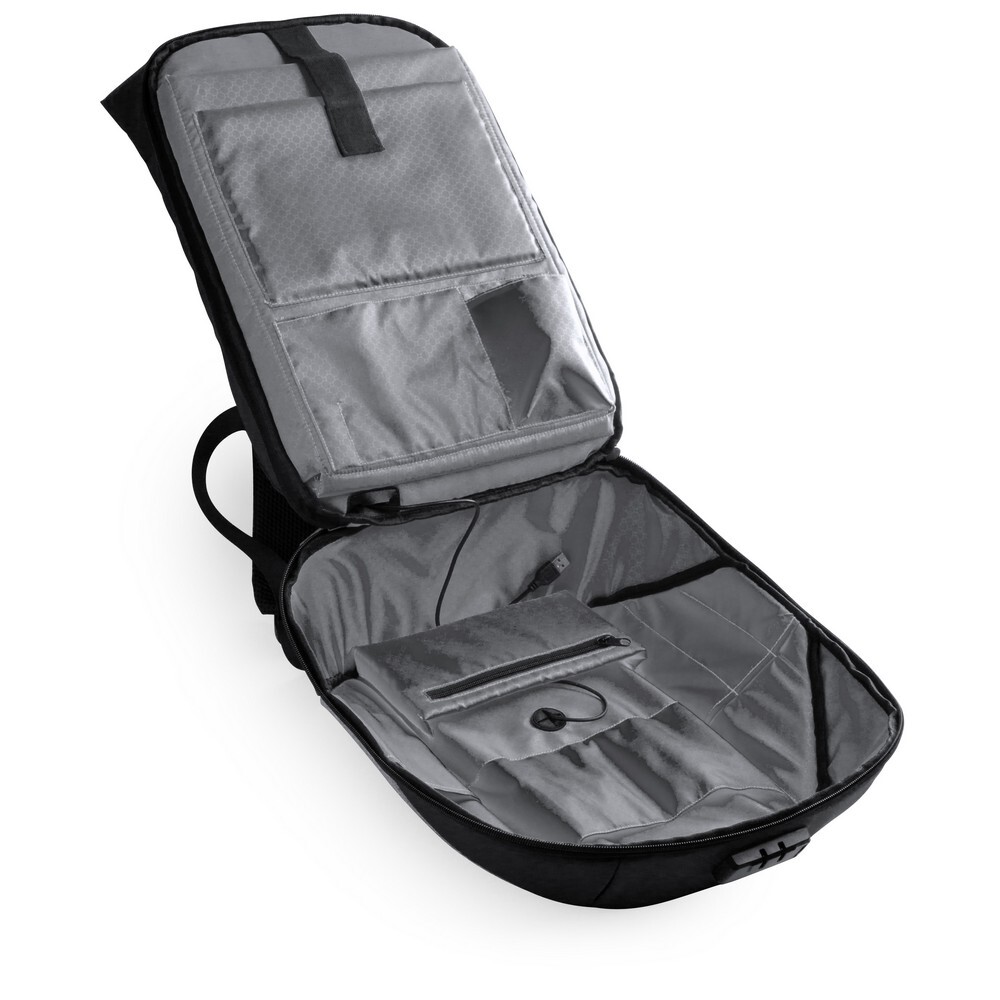 Plecak z miękką przegrodą na laptopa i tablet, ładowarka słoneczna, gniazdo USB do ładowania telefonów (power-bank nie dołączony), miękki tył i paski na ramię, zamek szyfrowy w komplecie