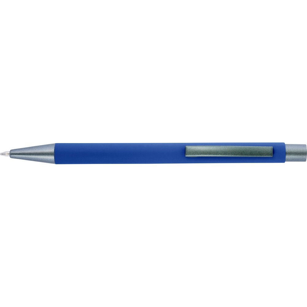 Długopis z kolorowym, gumowanym trzonem i szarymi elementami, grawer ukazuje lustrzaną powierzchnię
