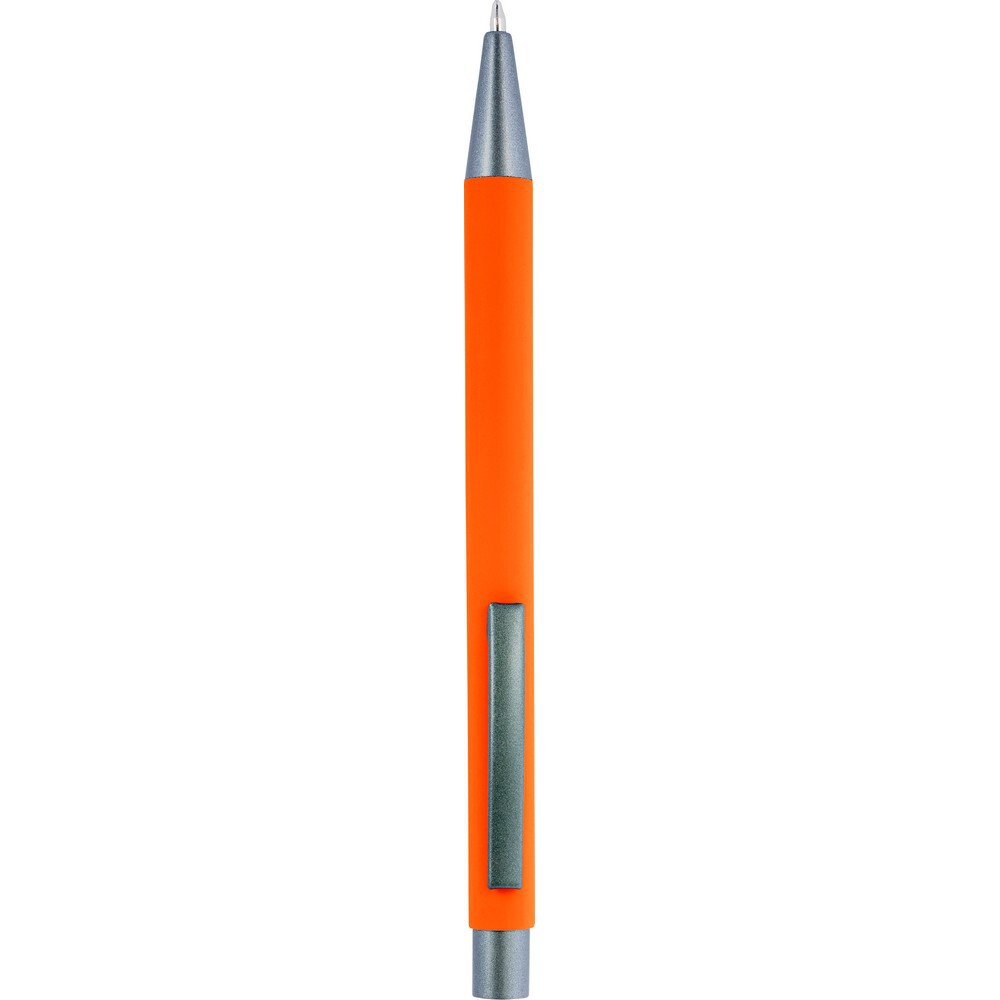 Długopis z kolorowym, gumowanym trzonem i szarymi elementami, grawer ukazuje lustrzaną powierzchnię