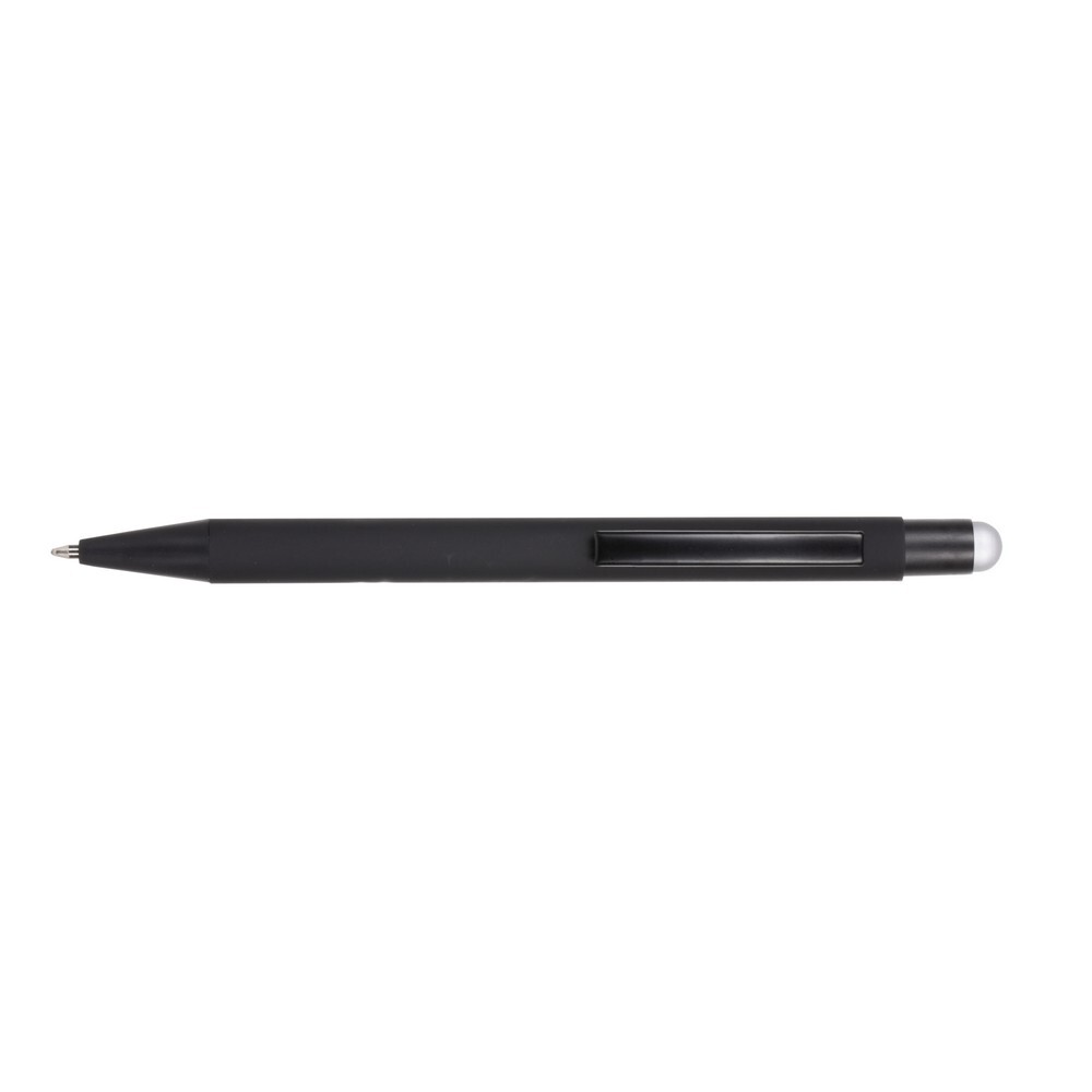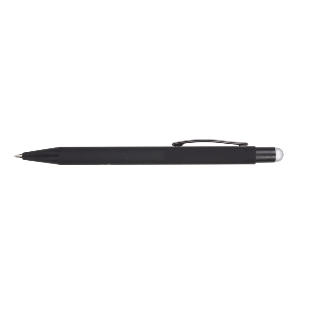 Długopis, touch pen, czarny gumowany trzon, grawer ukazuje błyszczącą powierzchnię w kolorze gumowej końcówki