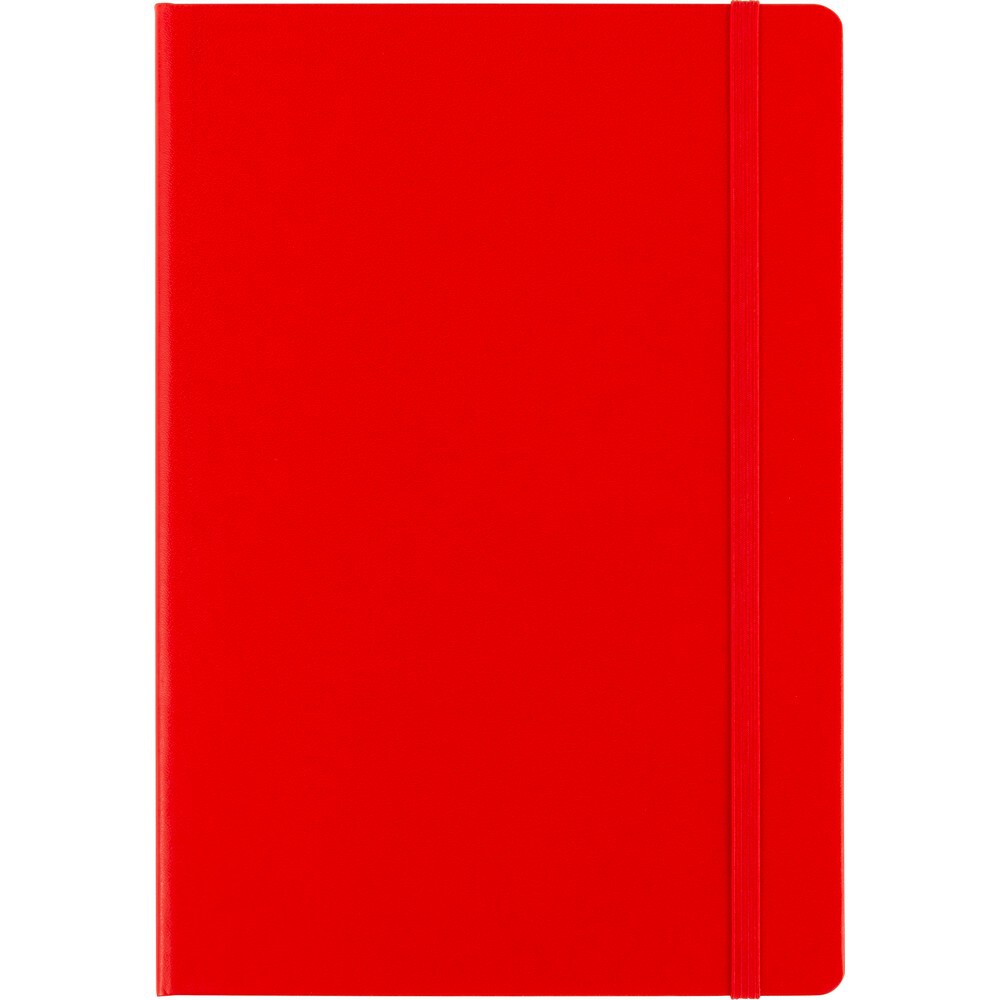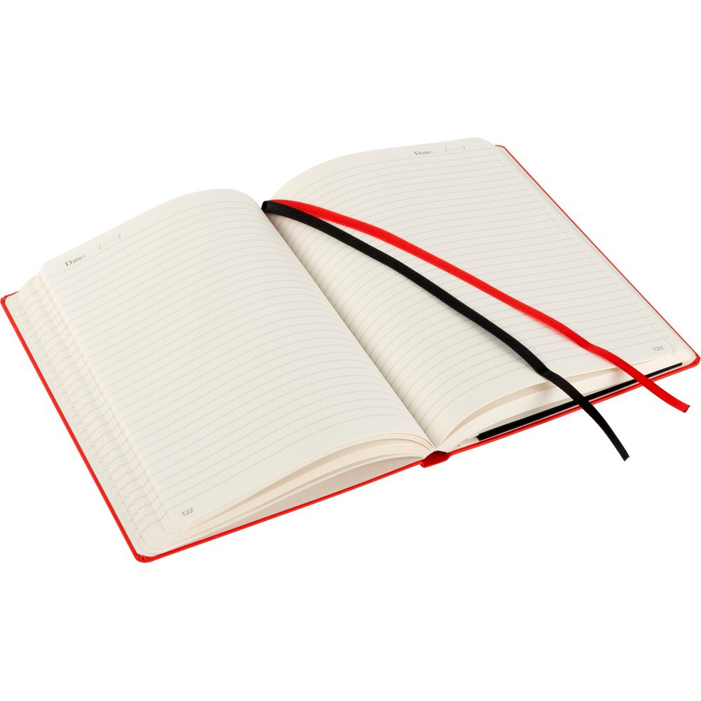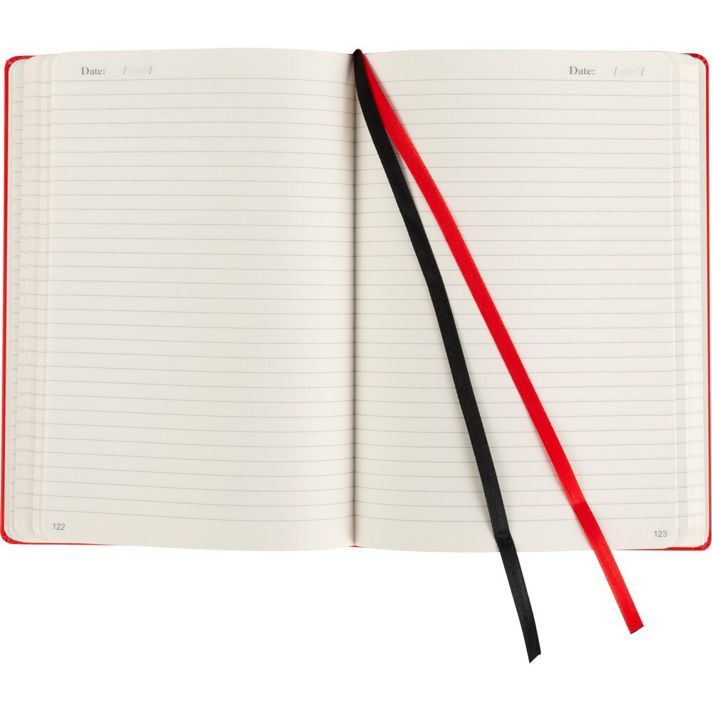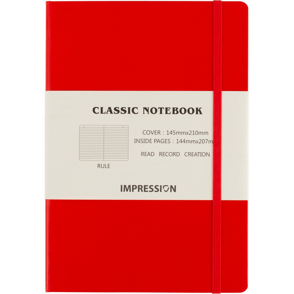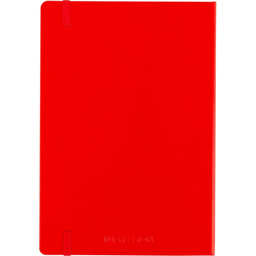 Notatnik (ok. A5, 128 kartek w linie), papierowa kieszeń na wewnętrznej stronie tylnej okładki, elastyczna opaska do zamykania i tasiemka zakładkowa, tylna okładka z logo IMPRESSION
