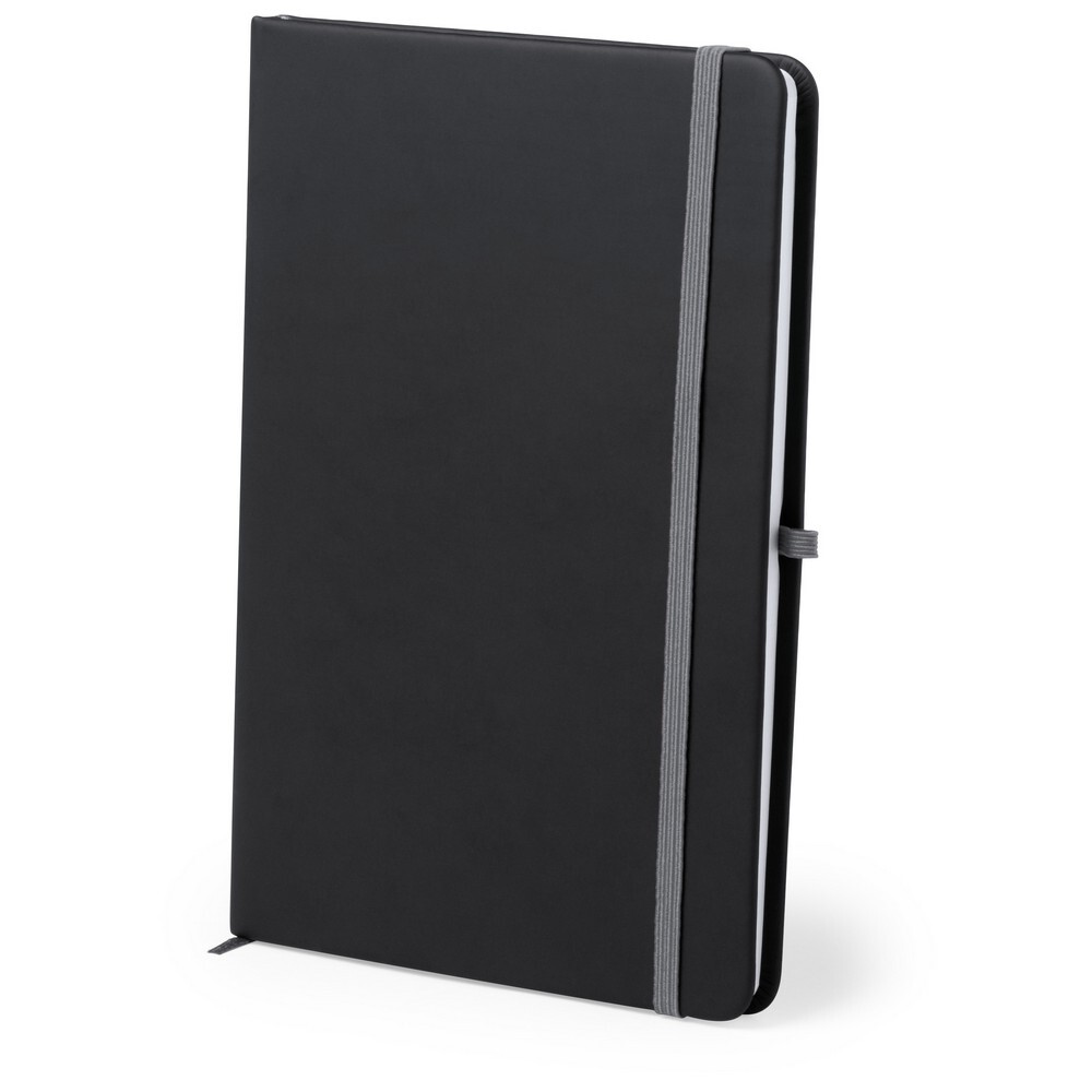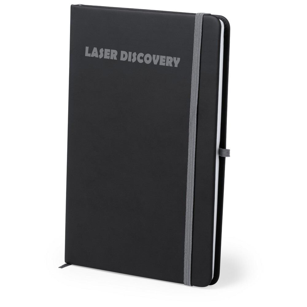 Notatnik A5 (100 kartek w linie), twarda okładka, grawer ukazuje powierzchnię w kolorze elastycznej opaski i tasiemki zakładkowej