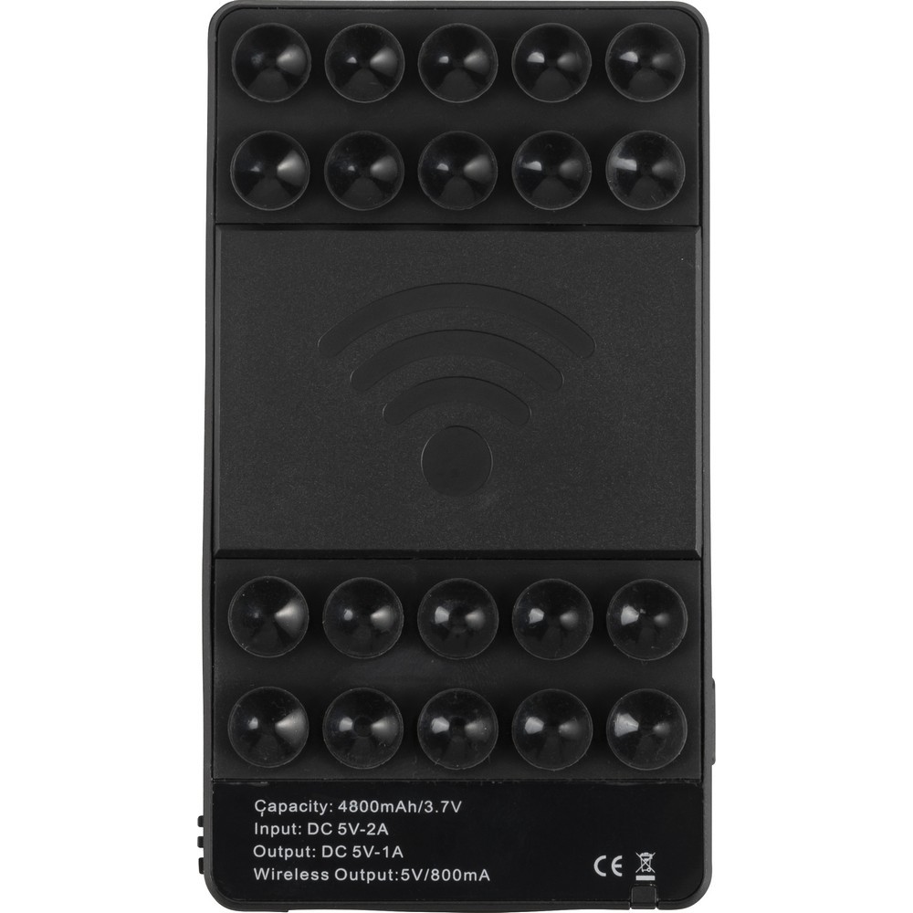Bezprzewodowy power bank 4600 mAh z przyssawkami, działa z telefonami posiadającymi możliwość ładowania indukcyjnego, wejście DC 5V-2A, wyjście DC 5V-1A, wyjście bezprzewodowe 5V/800 mA, w komplecie kabel 2 w 1, kompatybilny z urządzeniami Android oraz iOS