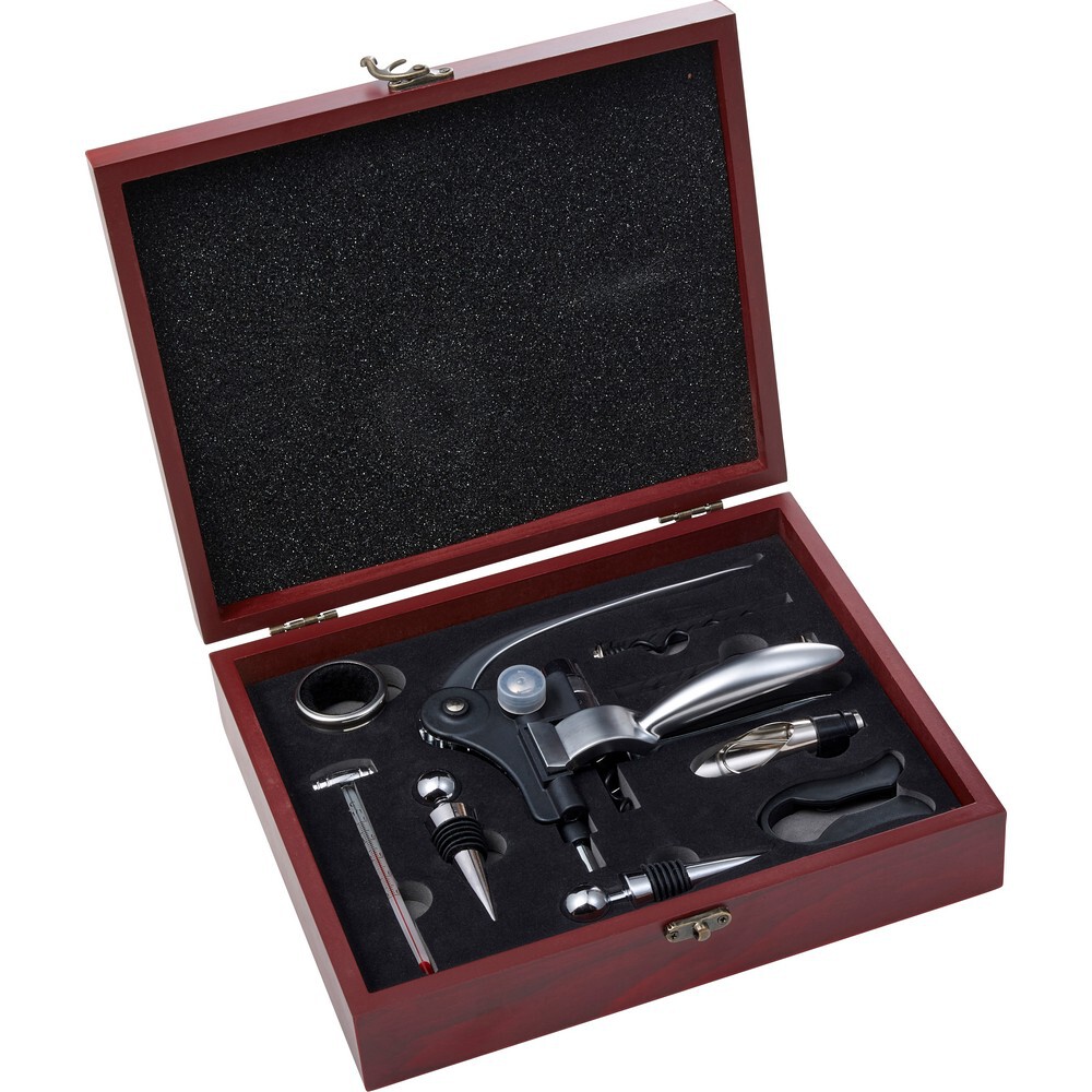 Zestaw do wina 9 el. w drewnianym pudełku, zawiera: 2 zatyczki, pierścień, termometr, nóż do folii, lejek i korkociąg