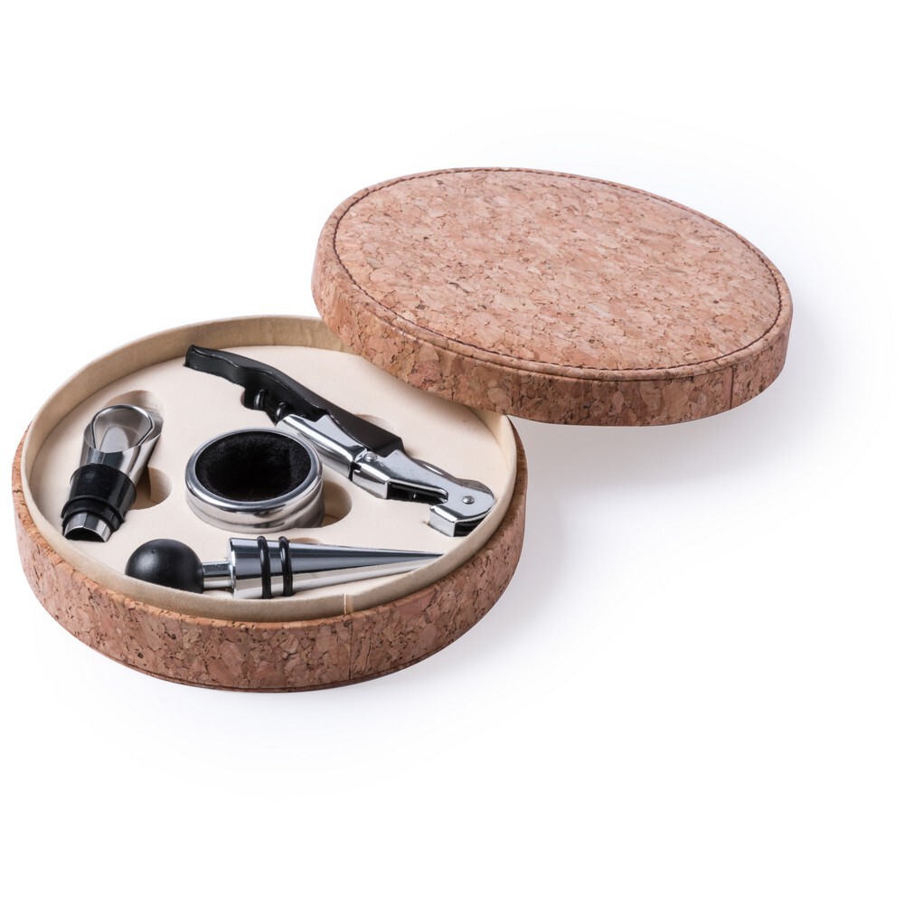 Zestaw do wina 4 el. w pudełku z naturalnego korka, akcesoria do wina: nóż kelnerski, pierścień, zatyczka i nalewak