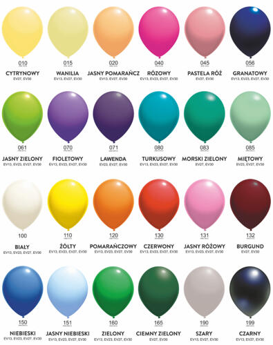 Przechowywać nie dłużej niż 12 miesięcy w suchym i ciemnym pomieszczeniu, w temperaturze powyżej +5°C. Waga i rozmiar jednej paczki balonów może ulec zmianie. Zarówno kolory poszczególnych balonów, jak i kolory na zdjęciach mogą się znacznie różnić od rzeczywistych-wynika to z różnorodności dostępnego sprzętu komputerowego oraz indywidualnych ustawień monitora i karty graficznej.