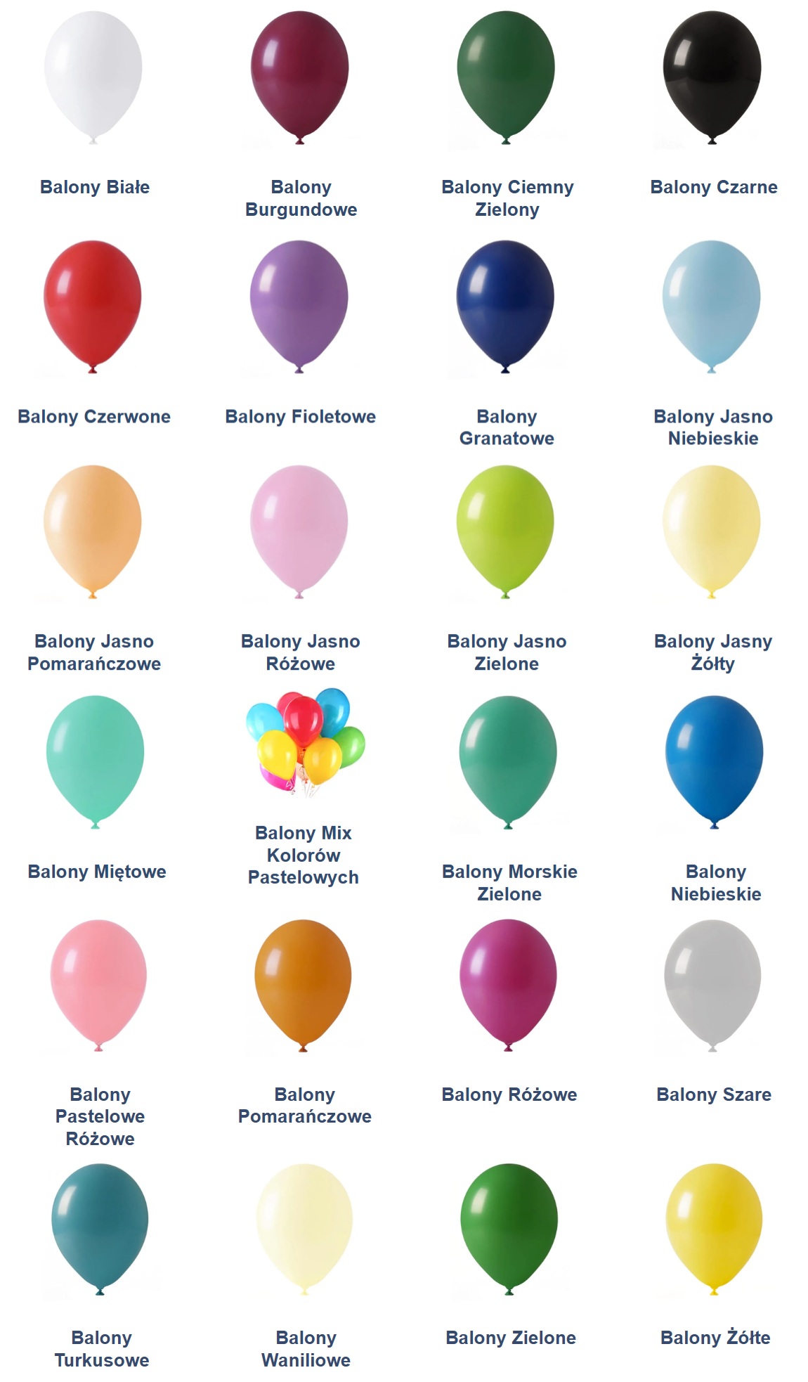 Zarówno kolory poszczególnych balonów, jak i kolory na zdjęciach mogą się znacznie różnić od rzeczywistych-wynika to z różnorodności dostępnego sprzętu komputerowego oraz indywidualnych ustawień monitora i karty graficznej.