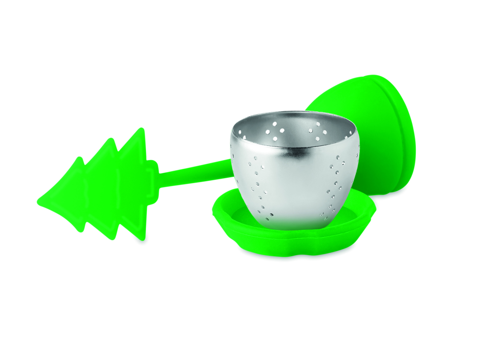 Silikonowy zaparzacz do herbaty z motywami świątecznymi zawiera mini silikonową płytkę.