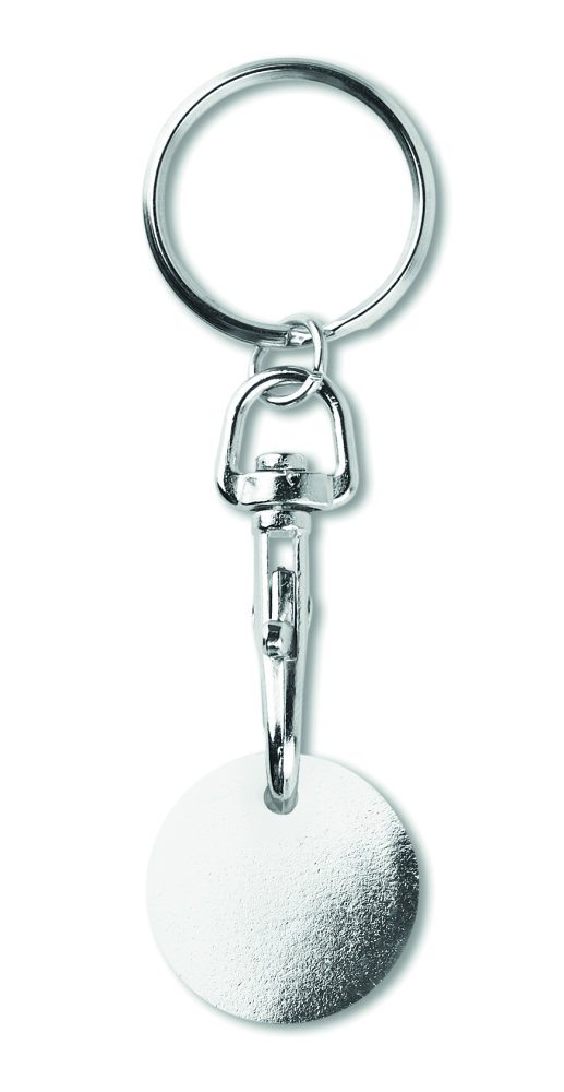 Brelok z żetonem (EURO) do wózka. Lakierowany na przedniej stronie. Żeton o wymiarach Ø3,2cm i grubości 2,1 mm.