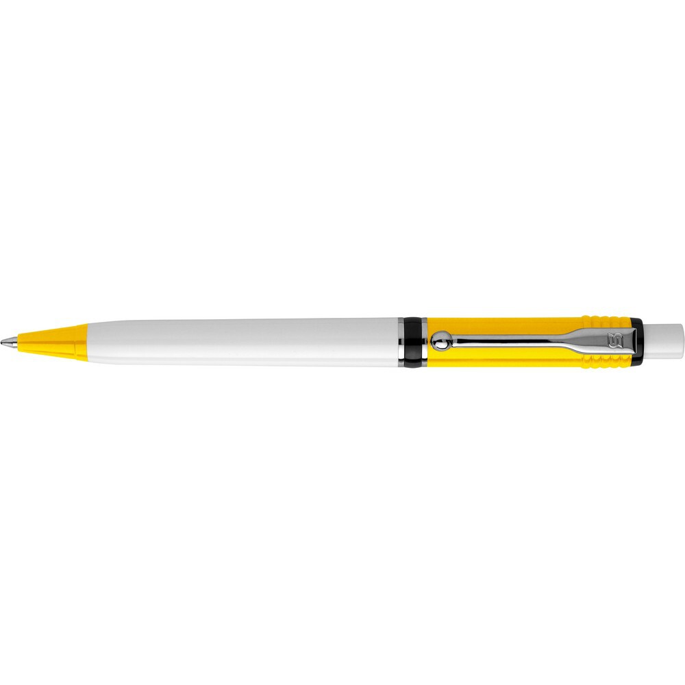 Długopis z białym trzonem, kolorowymi elementami i metalowym klipem