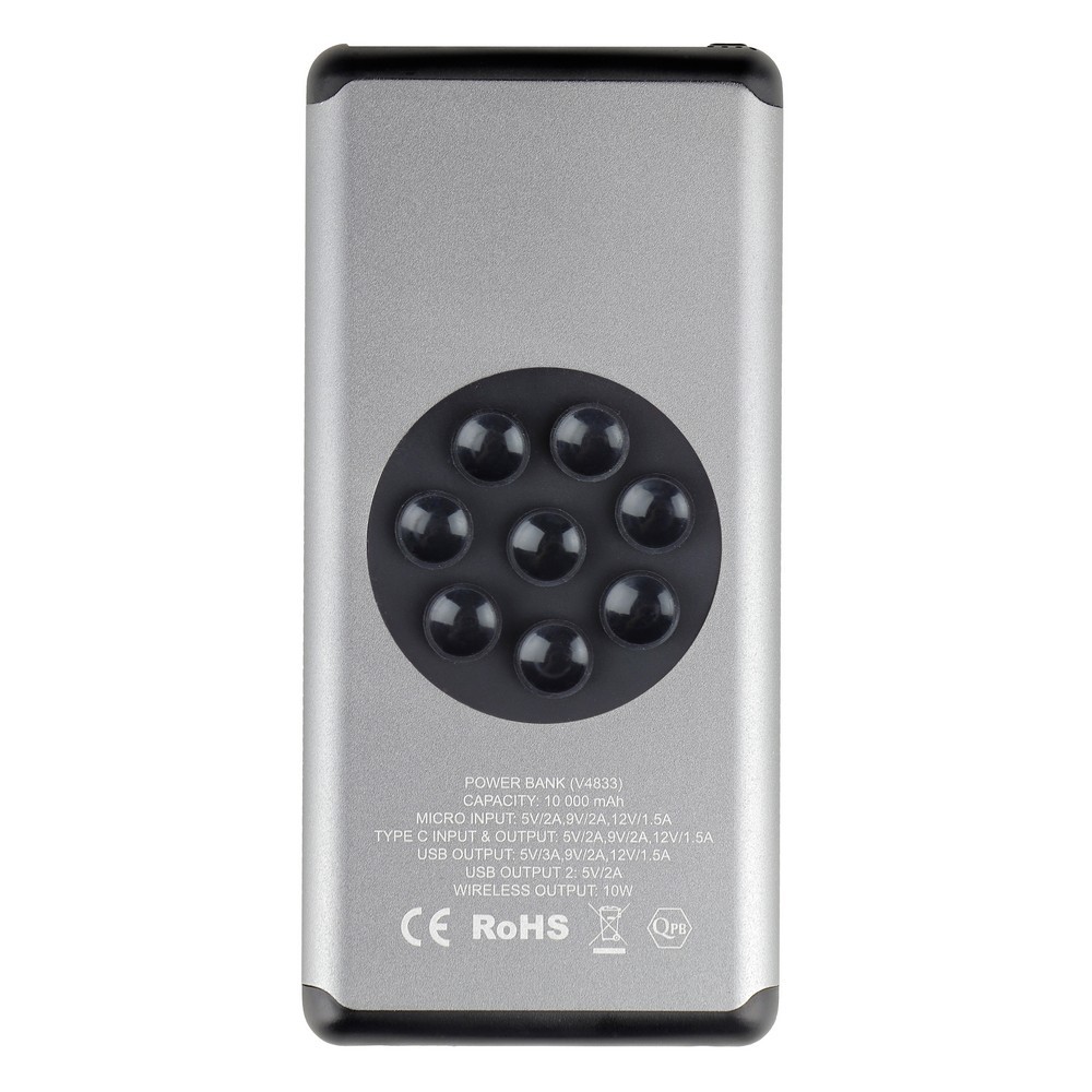 Bezprzewodowy power bank 10000 mAh z przyssawkami Mauro Conti, bezprzewodowa ładowarka 10W, działa z telefonami posiadającymi możliwość ładowania indukcyjnego, 2 wyjścia USB (max. 5V/2.4A, całkowite max. 3A) do ładowania dwóch urządzeń jednocześnie, wyjście USB typu C 5V/2.4A 9V/2A 12V/1.5A, wejście micro USB oraz typu C, kable micro USB oraz typu C w komplecie, w ozdobnym pudełku