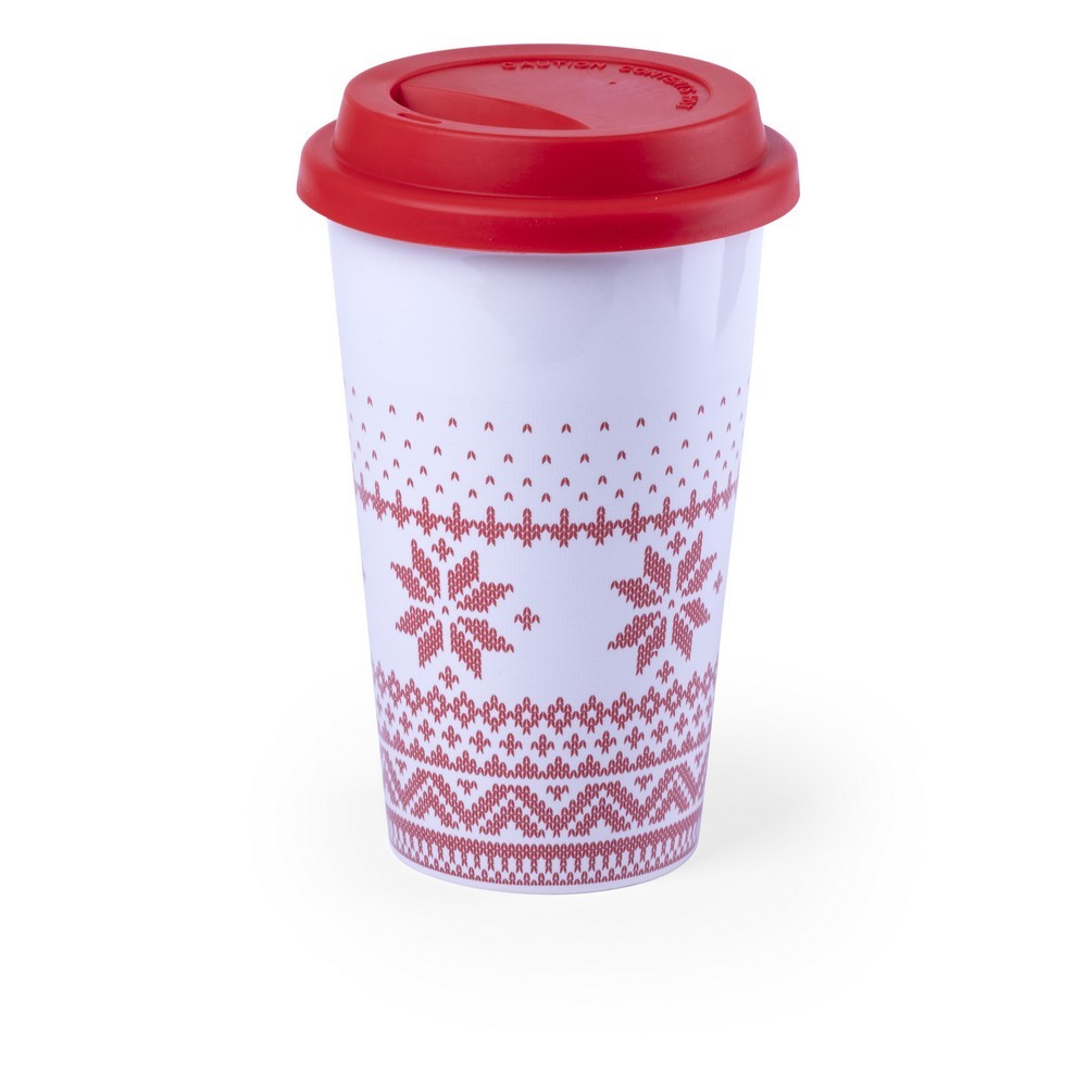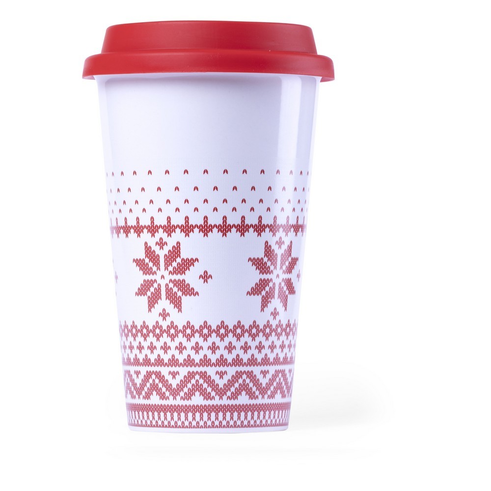 Kubek został wykonany z ceramiki, zaś czerwone wieczko z silikonu.