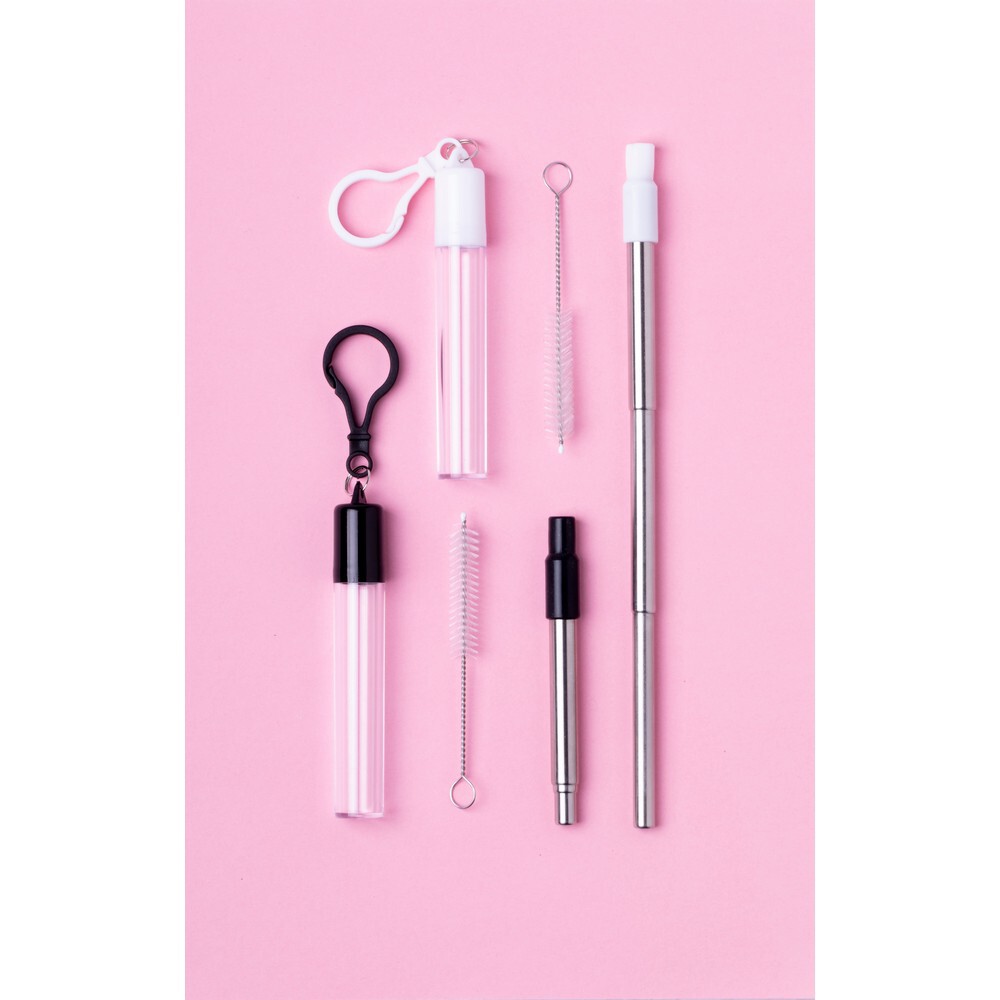 Wysuwana słomka wielokrotnego użytku ze stali nierdzewnej i silikonowym ustnikiem, czyścik i etui z karabińczykiem (do użytku promocyjnego) w komplecie