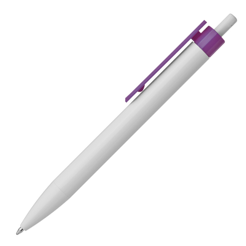 Biały długopis plastikowy CrisMa z kolorowym klipsem. Posiada wkład piszący na niebiesko. Znakowanie można umieścić na korpusie obok klipsa.