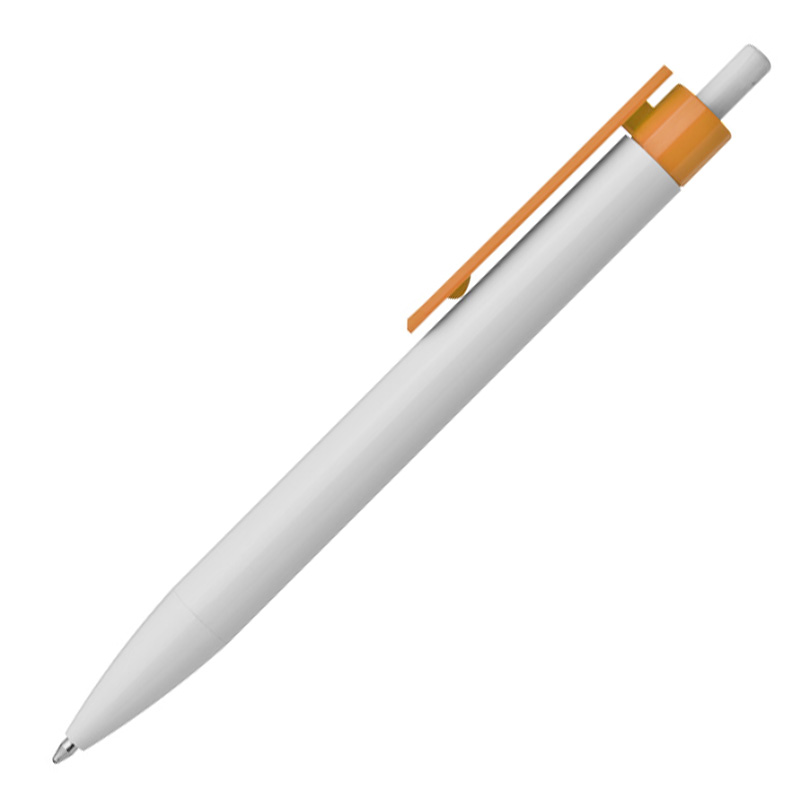Biały długopis plastikowy CrisMa z kolorowym klipsem. Posiada wkład piszący na niebiesko. Znakowanie można umieścić na korpusie obok klipsa.
