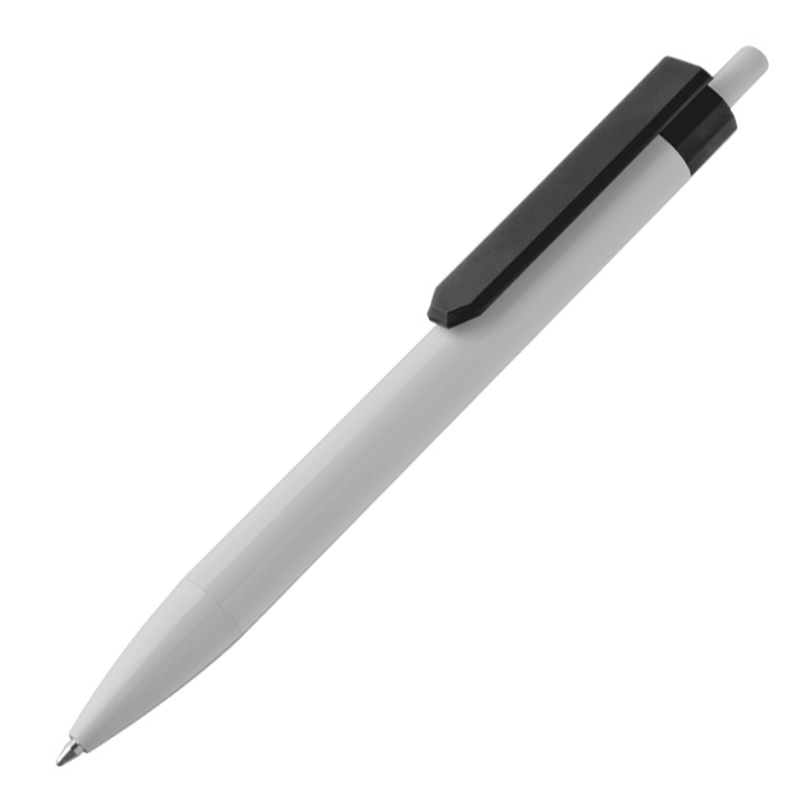 Biały długopis plastikowy CrisMa z kolorowym klipsem. Posiada wkład piszący na niebiesko. Znakowanie można umieścić na korpusie obok klipsa.