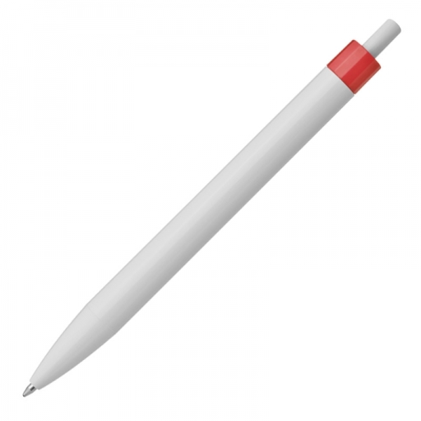 Biały długopis plastikowy CrisMa z kolorowym klipsem. Posiada wkład piszący na niebiesko. Znakowanie można umieścić na korpusie obok klipsa.