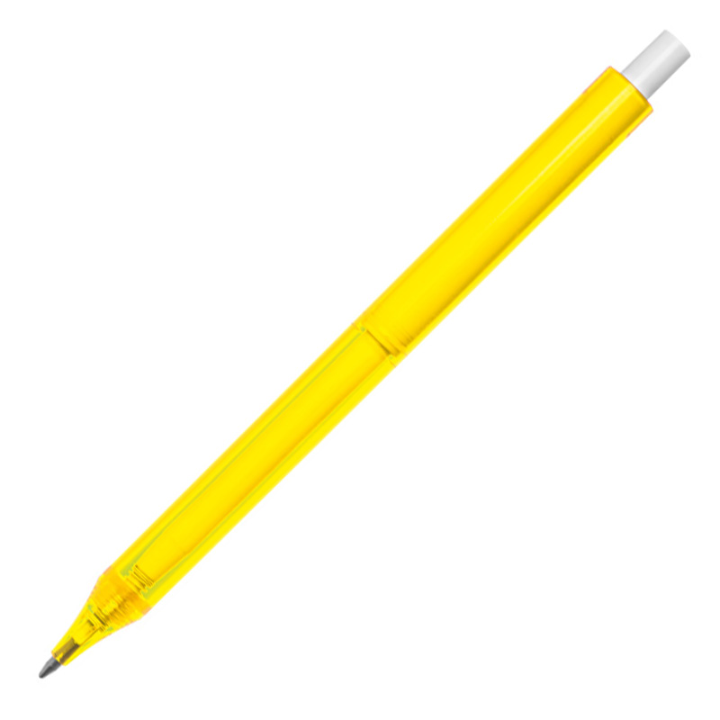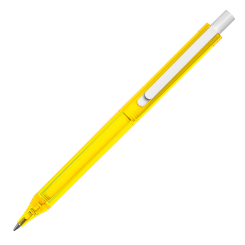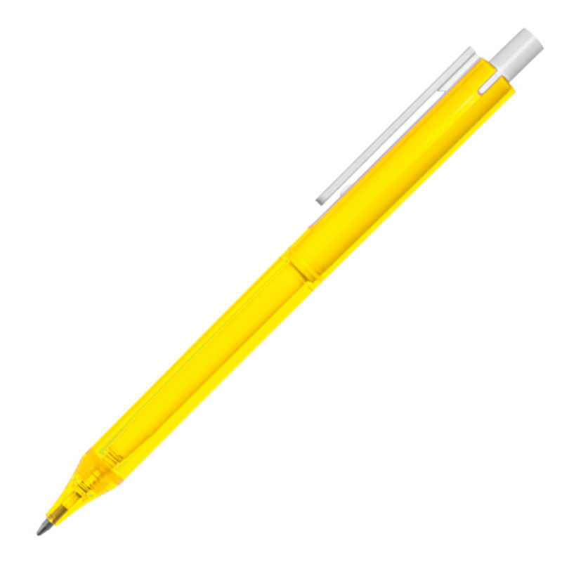 Plastikowy, transparentny długopis z białym klipem i niebieskim wkładem. Logotyp można umieścić na korpusie obok klipsa.
