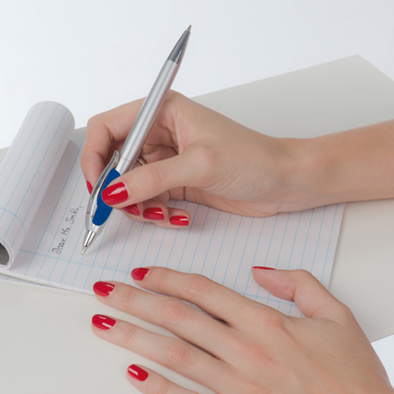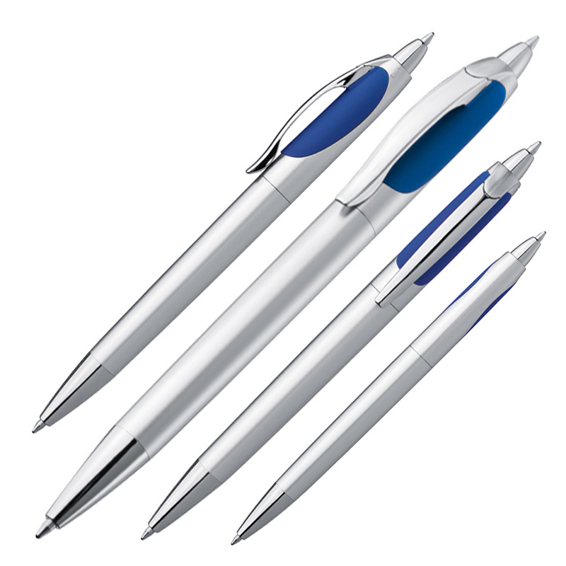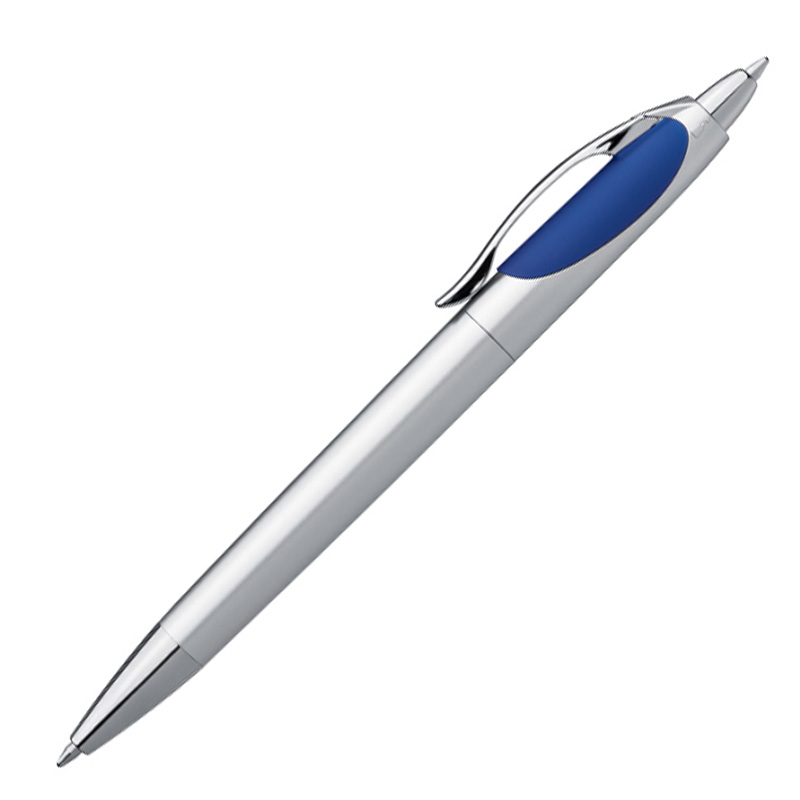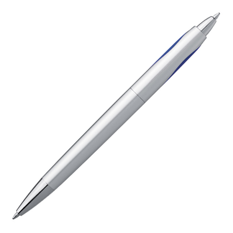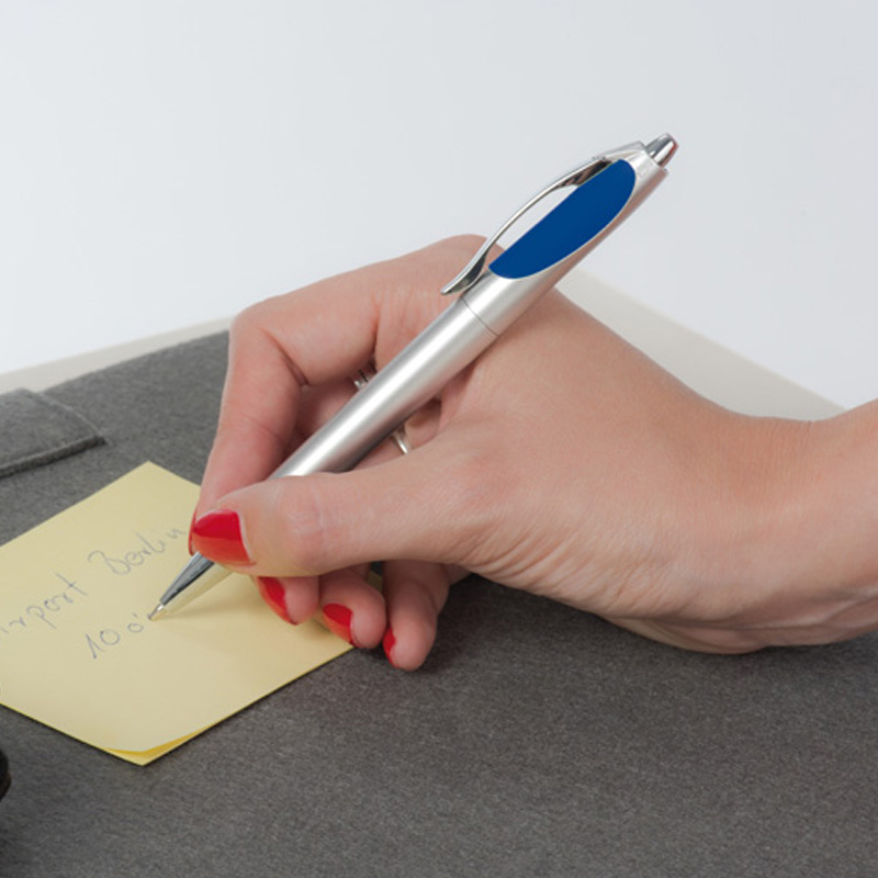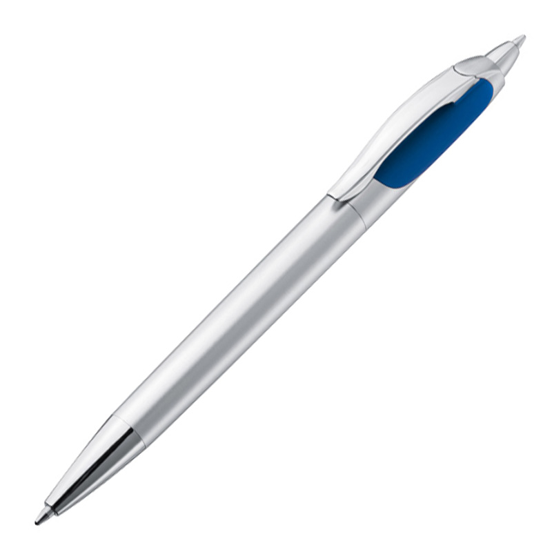 Długopis plastikowy z dwoma wkładami - czarnym i niebieskim. Obracając długopis w miejscu przycisku pojawia się wkład piszący na czarno. Logotyp można umieścić na korpusie obok klipsa.