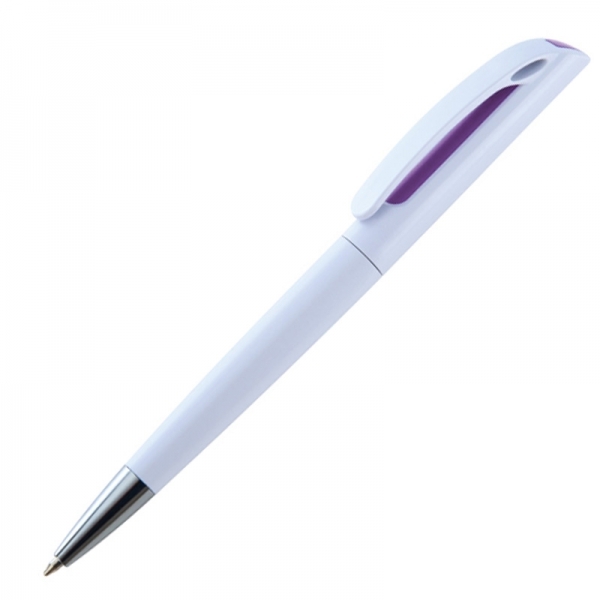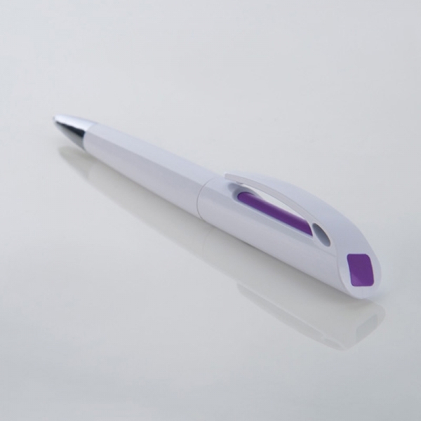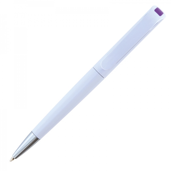 Biały długopis plastikowy z interesującym, kolorowym od spodu klipsem. Logotyp można umieścić na korpusie obok klipsa.