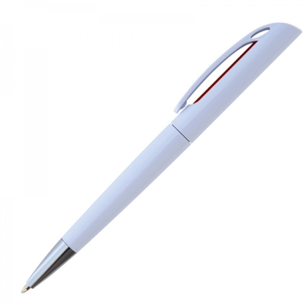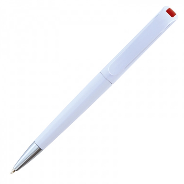 Biały długopis plastikowy z interesującym, kolorowym od spodu klipsem. Logotyp można umieścić na korpusie obok klipsa.