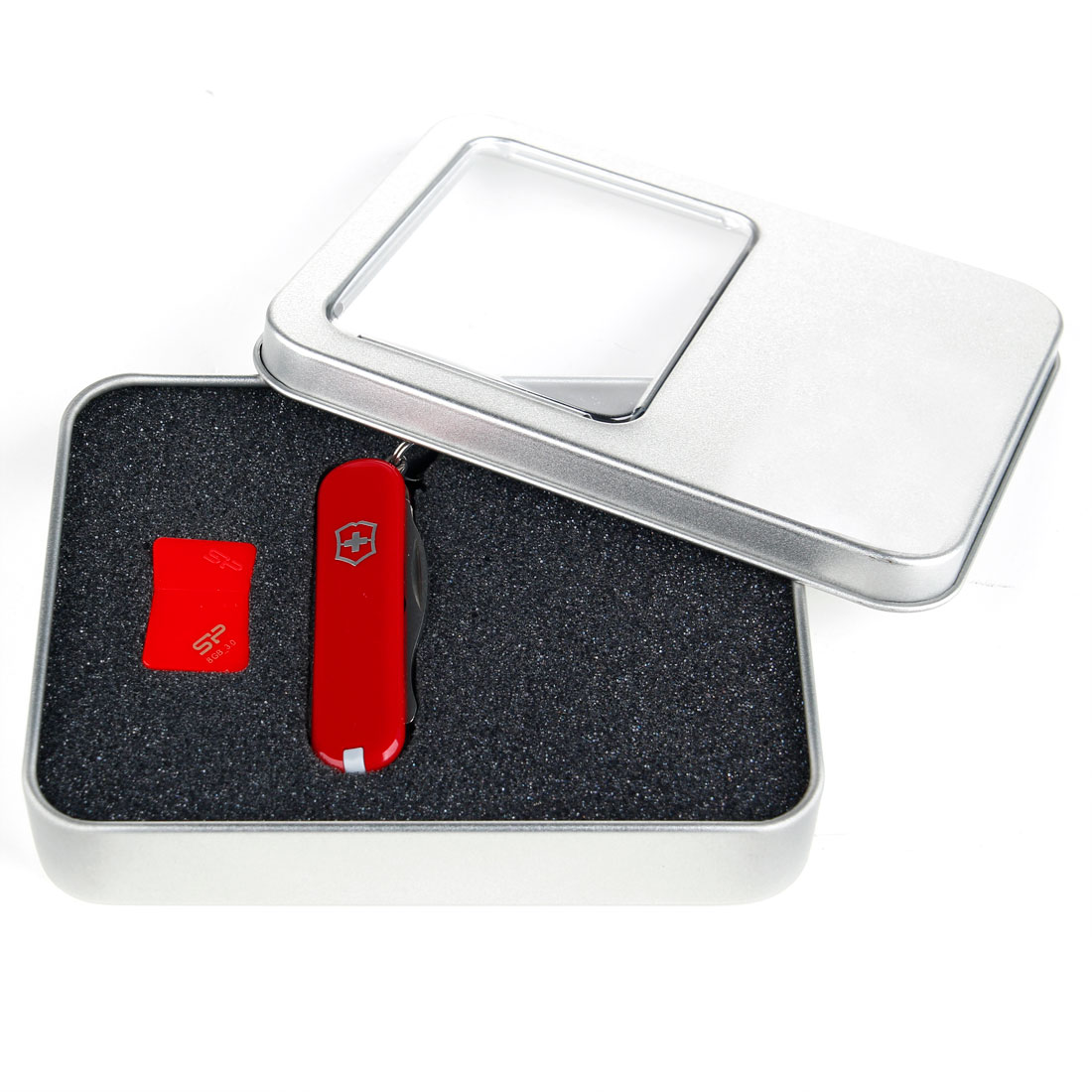 Zestaw składający się z pendrive'a Silicon Power EG 815605 o pojemności 8GB oraz scyzoryka marki VICTORINOX 0622305. Komplet zapakowany w metalowe pudełko EG OP29.