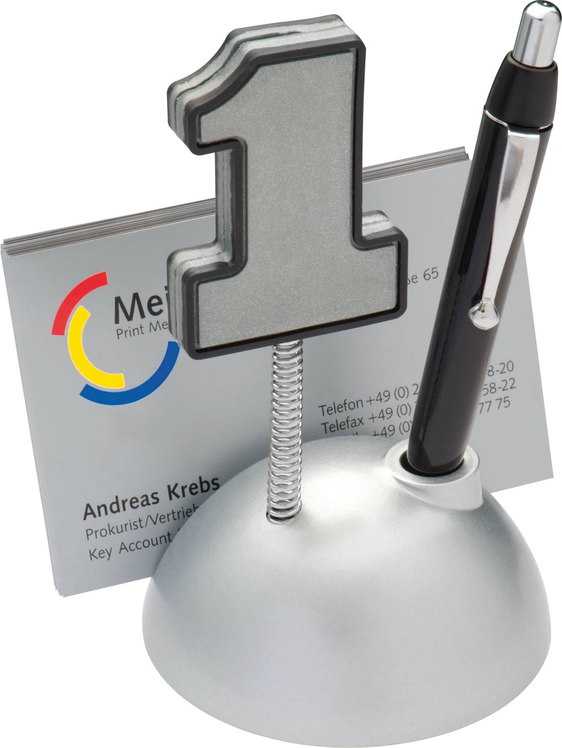 Bądź numerem 1 dla Twojego klienta! Pomoże Ci w tym zestaw na biurko - stojak, w którym możesz przechowywać notatki i wizytówki, z długopisem piszącym na niebiesko. Twoje logo umieścimy na podstawie stojaka. Pakowane pojedynczo w woreczek foliowy
