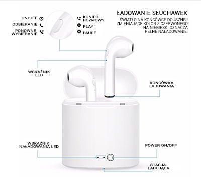 Zestaw słuchawek dousznych Bluetooth wraz ze stacją do ładowania. Pudełko pełni funkcję ładowarki, chroni też słuchawki przed zgubieniem. Z uwagi na niewielki rozmiar, słuchawki swobodnie można nosić w kieszeni.Specyfikacja:Rodzaj: BezprzewodoweBluetooth: v4.2Zasięg: 12 metrówCzas pracy słuchawek: 2-4hKompatybilne z: Android i iOSCzas ładowania: 1-2 hCzas czuwania: 100hCzułość: 32dBBateria w słuchawce: 55 mahBateria w stacji ładującej: 600mAhMikrofon: Tak