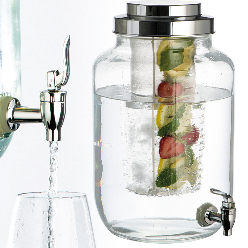 Szklany dozownik do napojów (pojemność 8 l.) przydatny na każdej imprezie, posiada zbiornik na owoce oraz lód, dzięki temu można przygotować napój dowolnej wielkości. Nadruk w formie etykietki umieszczony na produkcie. Pakowany pojedynczo w kartonik. Grupa nadruku: ET. Uwaga, ze względu na rozmiar i materiał dozownika, wysyłamy go paletami za dodatkowa opłatą: 50zł netto - 1/4 palety) 75zł netto - 1/2 palety) 110zł netto - 1 paleta)