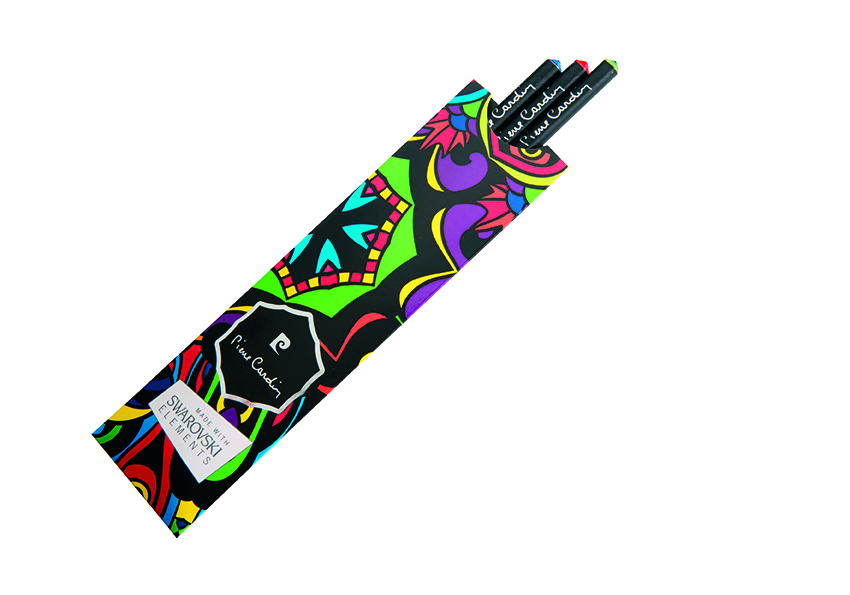 Zestaw składający się z trzech czarnych, zatemperowanych ołówków z kryształkami Swarovskiego w kolorach: niebieskim, czerwonym i zielonym. Całość zapakowana w papierowe etui z certyfikatem autentyczności Pierre Cardin.