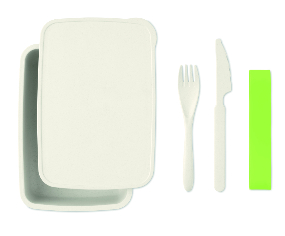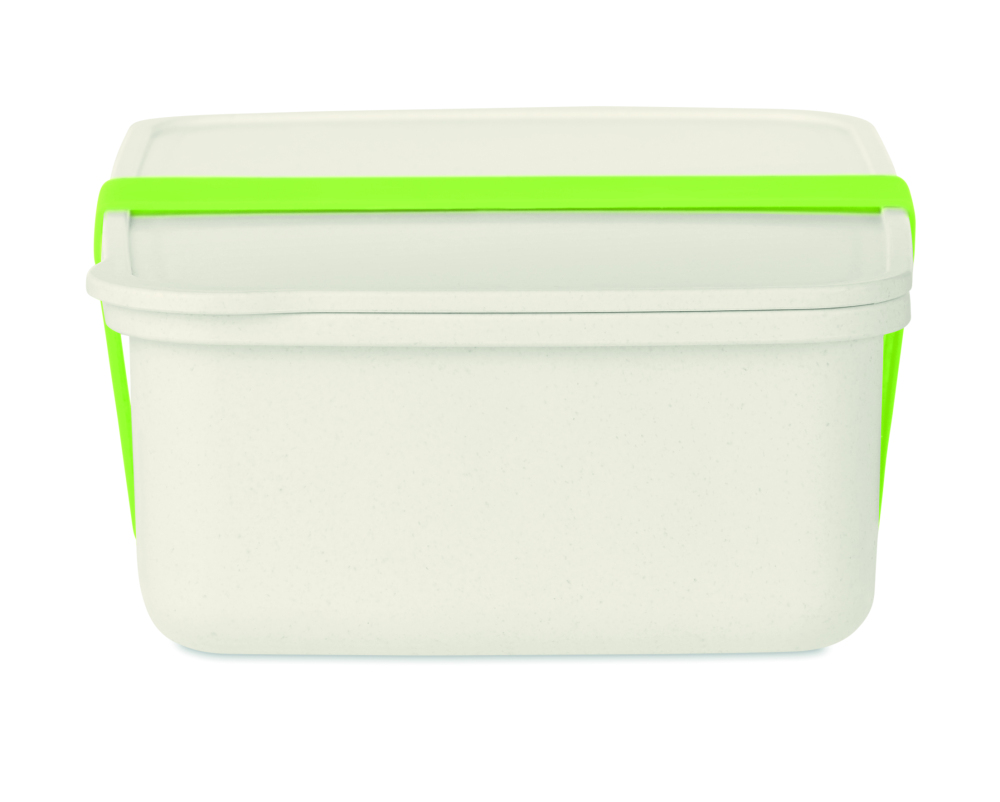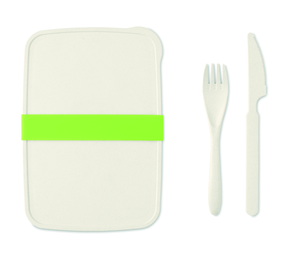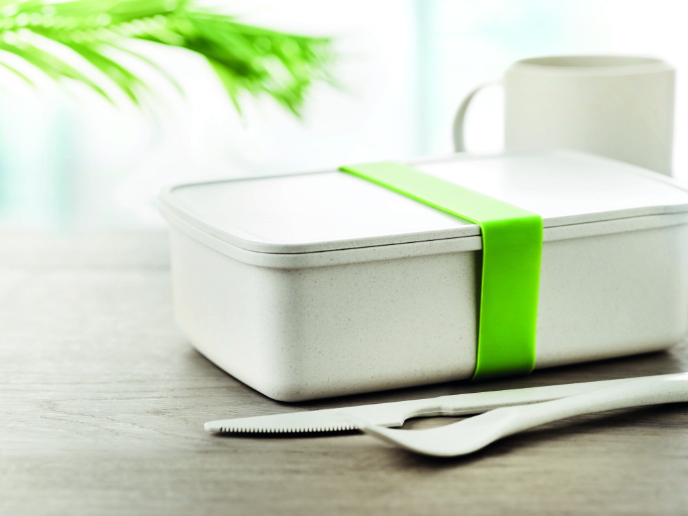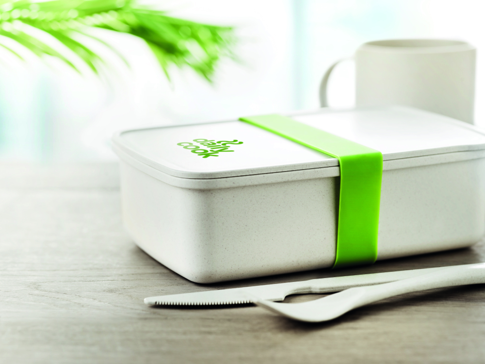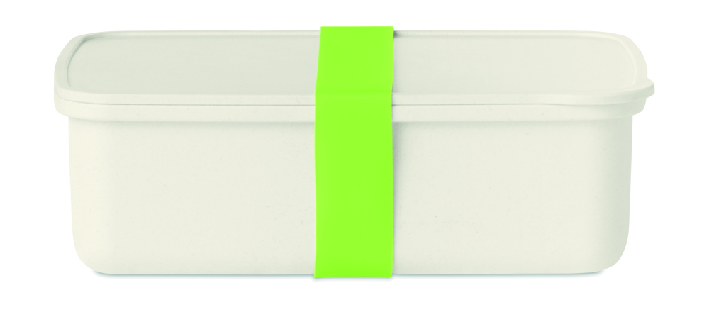 Lunchbox wykonany w 20% z włókna bambusowego i w 80% z kukurydzy PLA, z opaską silikonową.