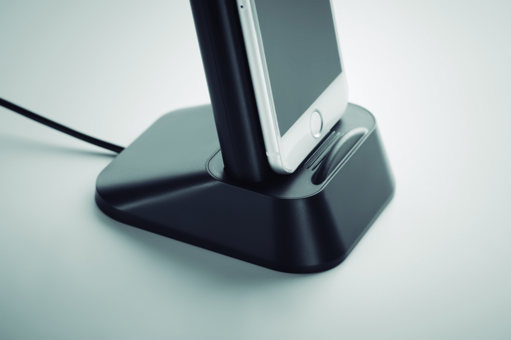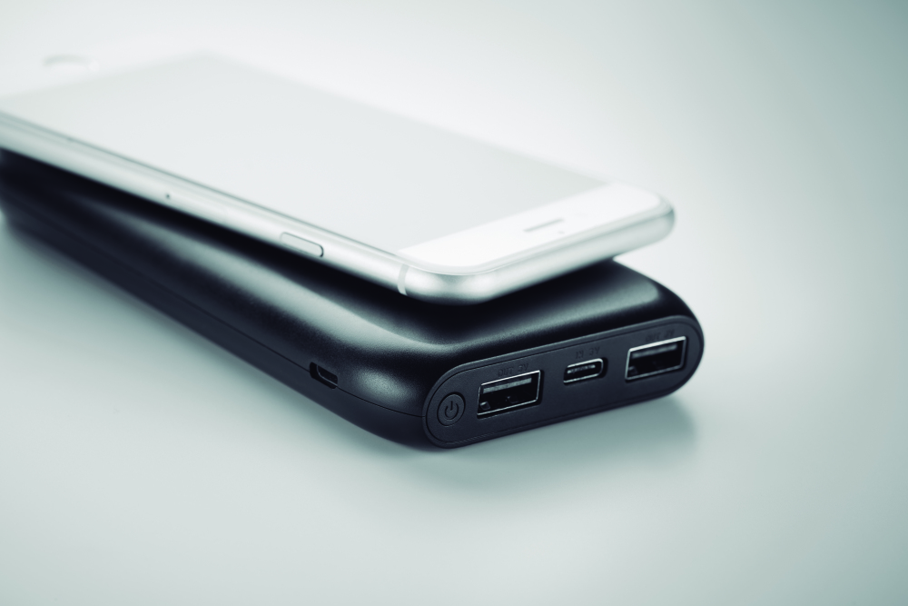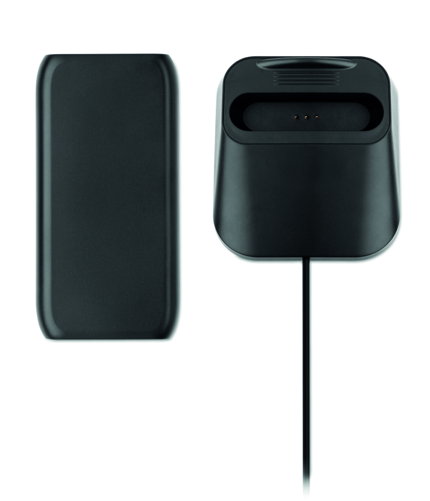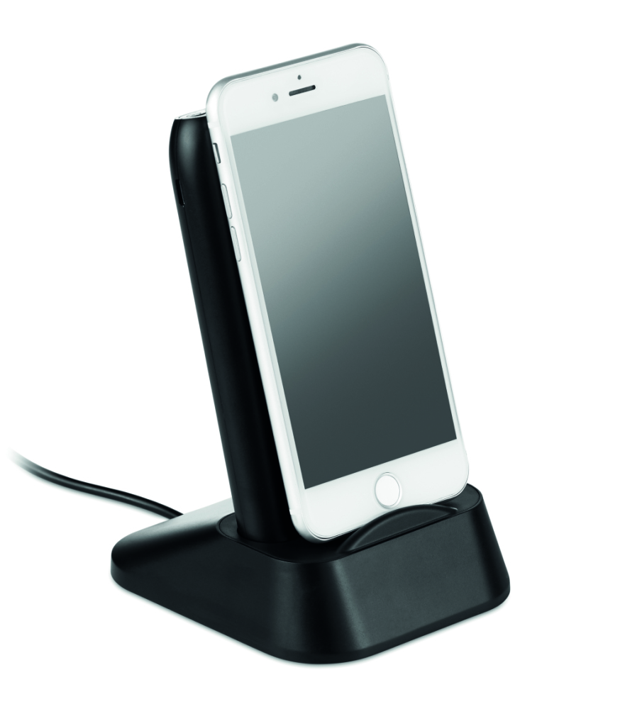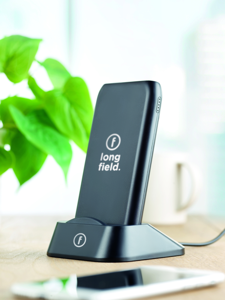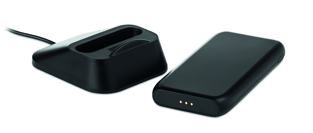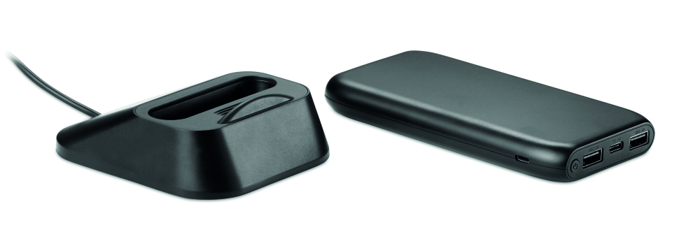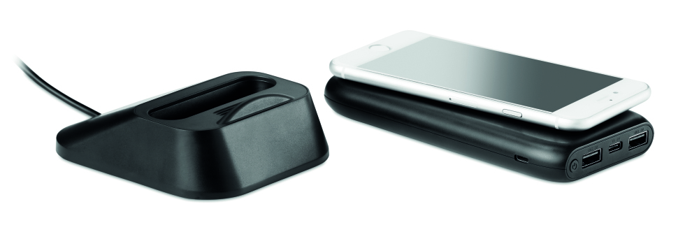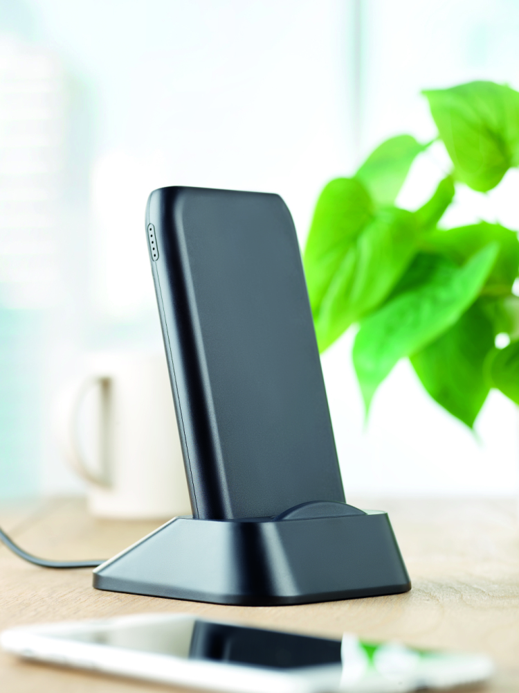 Bezprzewodowa ładowarka - powerbank 10.000 mAh z ABS, posiada stację dokującą do ładowania powerbanku, która może być również używana jako stojak na telefon.