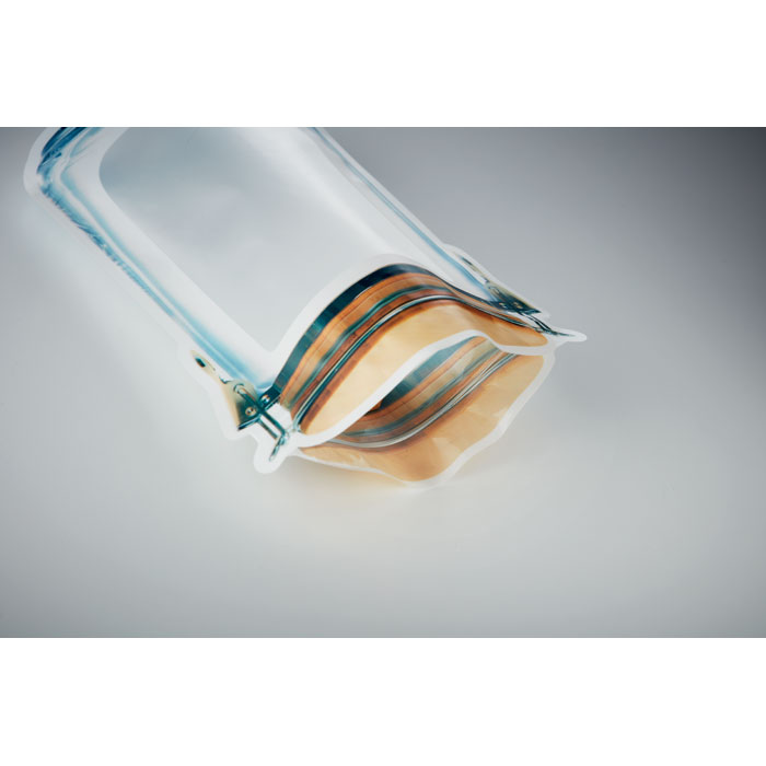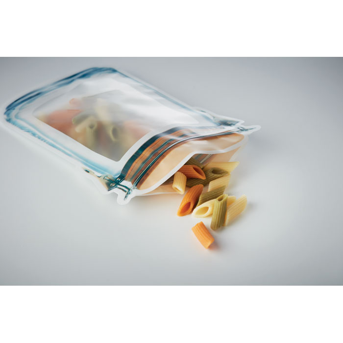 Duża,ekologiczna,szczelna torba do przechowywania żywności,wielokrotnego użytku. Odpowiednia do stosowania w temp. -10C do +50C. Woreczek PET(0,13mm)/MOPP z zamkiem PE. Z nadrukiem pojemnika. Bez BPA.