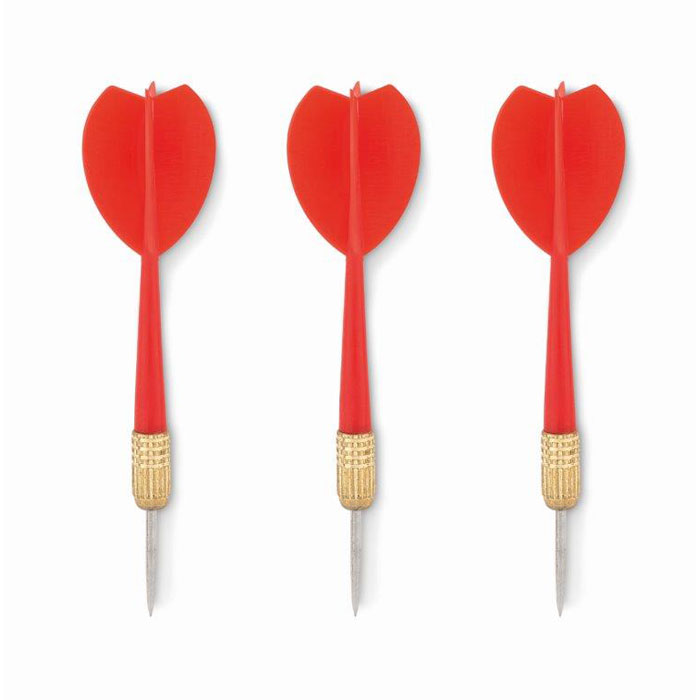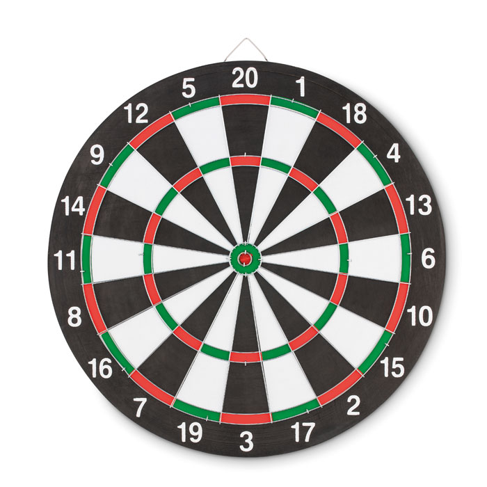 Dwustronna tarcza do gry w rzutki z haczykiem do powieszenia. W zestawie 3 rzutki wykonane z PVC.